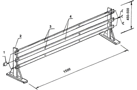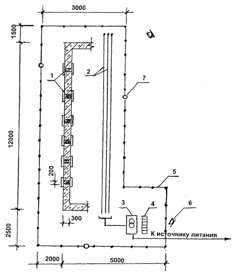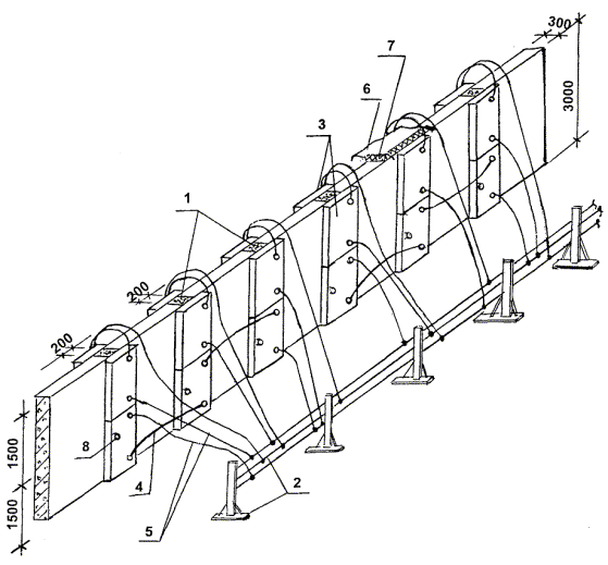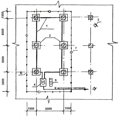 Рис. 1. Инвентарная секция шинопроводов (крайняя секция): 1 - разъем; 2 - деревянная стойка; 3 - болты; 4 - токопроводы (полоса 3´40 мм). Рис. 2. Схема организации рабочей зоны при электродном прогреве бетона при замоноличивании стыков колонн с фундаментами: 1 - комплектная трансформаторная подстанция КТП ТО-80/86; 2 - прожектор; 3 - секции шинопровода; 4 - кабель КРПТ 3´2,5; 5 - кабель КРПТ 3´50; 6 - диэлектрический коврик; 7 - инвентарное ограждение; 8 - сигнальная лампа красного цвета. Рис. 3. Схема организации рабочей зоны при индукционном прогреве бетона при замоноличивании стыков: 1 - кабель КРПТ 1´25; 2 - индуктор; 3 - прожектор; 4 - трансформаторная подстанция КТП ТО-80/86; 5 - диэлектрический коврик; 6 - инвентарное ограждение; 7 - сигнальная лампочка красного цвета. Рис. 4. Схема организации рабочей зоны электрообогрева бетона при замоноличивании стыков греющей опалубкой с пластинчатыми электронагревателями: 1 - монолитный железобетонный стык (сеч. 200´300) в металлической опалубке; 2 - инвентарные секции шинопроводов; 3 - трансформаторная подстанция КТП ТО-80/86; 4 - диэлектрический коврик; 5 - инвентарное ограждение; 6 - прожектор; 7 - сигнальная лампочка красного цвета. Рис. 5. Электрическая схема электродного прогрева бетона при замоноличивании стыков