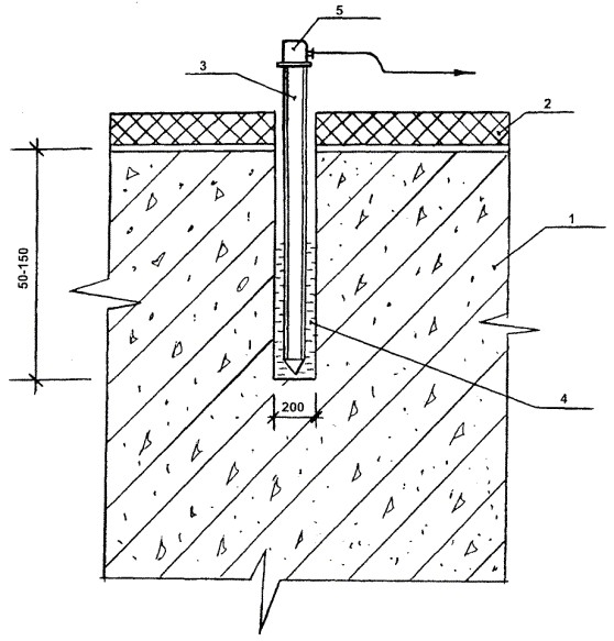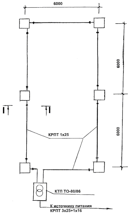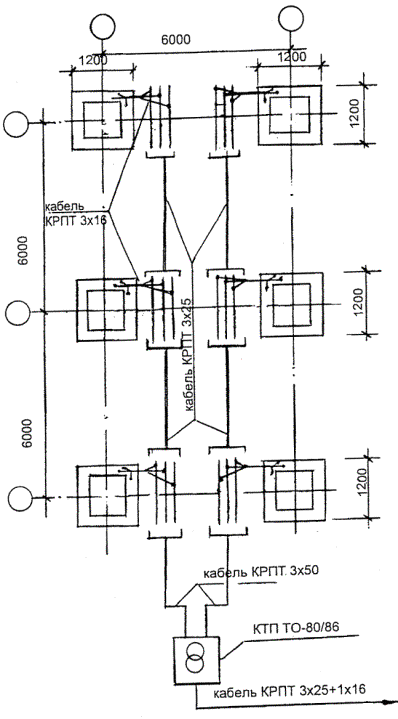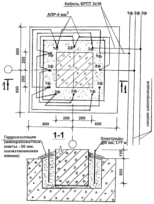 2.16. Электропрогрев бетона при замоноличивании стыков колонн в стакане фундамента производят с помощью стержневых электродов с утеплением открытой поверхности бетона минеральной ватой толщиной 50 мм и гидроизоляцией полиэтиленовой пленкой в следующей последовательности: - через слои гидро- и теплоизоляции в бетонную смесь забивают электроды согласно схемы (рис. 8); - в качестве электродов приняты стальные стержни диаметром 6 мм, длиной 1000 мм; - электроды устанавливают таким образом, чтобы их концы выступали из бетона на 10 - 20 см; - расстояние между электродами принимают в зависимости от температуры наружного воздуха и принятого напряжения (таблица 2); - производят коммутацию электродов между собой и подключают их к секциям шинопроводов (рис. 8); - подают напряжение на электроды в соответствии с электрическими параметрами (таблица 1); - разогрев бетона производят со скоростью 5 °С в час в соответствии с графиком температурного режима, приведенного в п. 2.5. 2.16.1. Сразу после подачи напряжения дежурный электрик повторно проверяет все контакты, устраняет причину короткого замыкания, если оно произошло. 2.16.2. При необходимости отключения стержневого электрода рядом устанавливают новый и подключают его. 2.16.3. Электропрогрев осуществляется на пониженном напряжении 65 - 95 В. Удельное электрическое сопротивление бетонной смеси в начале прогрева 9 Ом×м. 2.16.4. Операции по электродному прогреву выполняет звено из 3-х человек в следующей последовательности: бетонщик и электромонтер III р. устанавливают ограждение рабочей зоны, сигнальное освещение и размещают указатели по технике безопасности; бетонщик III р. заготавливает из стали диаметром 6 мм электроды необходимой длины и в нужном количестве; электромонтер V р. производит разделку концов жил кабеля, подсоединяет его к трансформаторной подстанции КТП ТО-80/86; электромонтер III р. расставляет инвентарные секции шинопроводов вдоль захватки, соединяет их между собой; электромонтер V р. подсоединяет секции шинопроводов к трансформаторной подстанции, производит ее заземление и опробывает ее работу на холостом ходу. После укладки бетонной смеси бетонщик укрывает верхние поверхности конструкции гидро- и теплоизоляцией; электромонтеры V и III р. расставляют электроды в конструкцию согласно выбранной схемы, производят коммутацию электродов между собой и подключают их к секциям шинопровода. Подают напряжение на электроды. Электрические параметры электродного прогрева бетона при замоноличивании стыков колонн с фундаментом Таблица 2