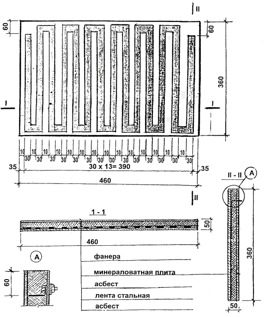 В данной карте приняты: сечение кабеля индуктора - 25 мм2, напряжение - 75 В, сила тока - 115 А, количество витков индуктора - 78 (6 индукторов по 13 витков, соединенные последовательно). Потребная электрическая мощность с учетом расчетной температуры наружного воздуха -15 °С и сечения кабеля 25 мм2 в соответствии с температурным режимом прогрева составит на шесть стыков: на предварительный отогрев арматуры и опалубки - 8,62 кВт×час; на разогрев бетонной смеси до 60 °С - 94,87 кВт×час; на изотермический прогрев - 66,3 кВт×час; общая потребность - 169,79 кВт×час. 2.18. Электрообогрев бетона при замоноличивании стыков стеновых панелей осуществляется с помощью металлической опалубки, оборудованной пластинчатыми нагревателями, утепленной минеральной ватой толщиной 50 мм с защитным покрытием из фанеры толщиной 3 мм (рис. 12, 13, 14) в следующей последовательности: - в зависимости от температуры наружного воздуха принимают электрические параметры обогрева (табл. 4) и в течение одного часа производят предварительный отогрев опалубки и арматуры; - параметры обогрева определены для бетонирования шести вертикальных стыков прямоугольного сечения между стеновыми панелями резервуаров и отстойников с сечением стыка 200´300 мм, высотой 3 м с общим объемом бетона 1,08 м3 исходя из температуры наружного воздуха -20 °С и достижения прочности бетона к моменту остывания 0 °С не менее 50 % R28; - после укладки бетона в конструкцию стыка начинают разогрев его до температуры изотермической выдержки 60 °С. 2.18.1. Предварительный отогрев опалубки и арматуры в течение одного часа, а также разогрев бетона до 60 °С ведется на напряжение 95 В, изотермическая выдержка бетона осуществляется при напряжении 75 В. 2.18.2. Электрообогрев ведется в соответствии с графиком температурного режима, приведенного в п. 2.5. 2.18.3. Раскладка щитов и подключение их к шинопроводам производятся по принятой схеме (рис. 15). 2.18.4. Операции по прогреву бетона при замоноличивании стыков стеновых панелей выполняет звено из 3-х человек в следующей последовательности: - бетонщик III р. и электромонтер III р. устанавливают ограждение рабочей зоны, плакаты по технике безопасности, сигнальное освещение; - электромонтер V р. производит разделку концов жил кабеля, подсоединяет его к трансформаторной подстанции КТП ТО-80/86; - электромонтер III р. расставляет инвентарные секции шинопроводов, соединяя их между собой; - электромонтер V р. подсоединяет секции шинопроводов к трансформаторной подстанции и производит ее заземление, опробывает работу трансформаторной подстанции на холостом ходу; - электромонтер V и III р коммутируют щиты опалубки между собой и секциями шинопровода. Подают напряжение на щиты опалубки. Электрические параметры электрообогрева греющей опалубкой, оборудованной пластинчатыми нагревателями Таблица 4