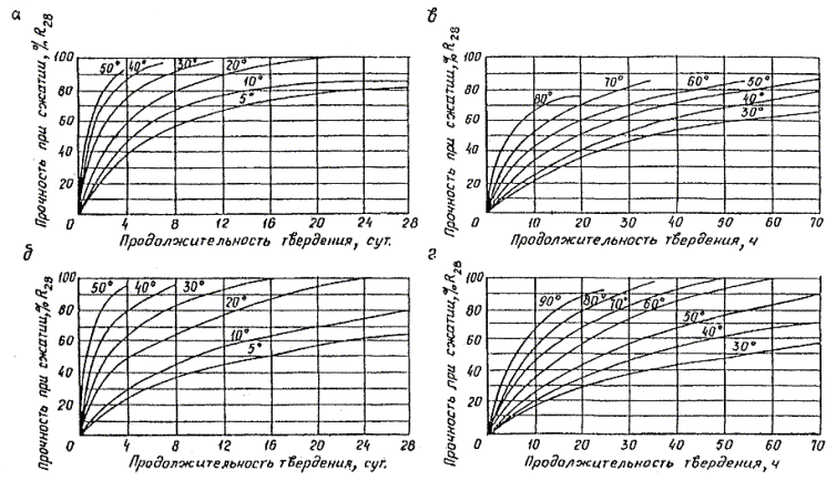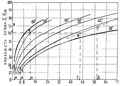 Рис. 7. Электрическая схема электрообогрева бетона при замоноличивании стыков греющей опалубкой с пластинчатыми электронагревателями Рис. 8. Схема расстановки электродов при электродном прогреве фундамента с колонной Рис. 9. Устройство индуктора Рис. 10. Принципиальная схема индуктора Рис. 11. Стык колонны с колонной. Разрезы I-I, II-II Рис. 12. Расстановка нагревателей на стальных щитах опалубки Рис. 13. Секция пластинчатого электронагревателя: 1 - пластинчатый нагреватель; 2 - зигзаг из стальной ленты сеч. 10´0,2 мм; 3 - асбестовый лист 500´400´8 - 2 шт.; 4 - минераловатная плита d = 50 мм (500´400); 5 - фанера - 3 мм (500´400); 6 - болтовой контакт. Рис. 14. Пластинчатые нагреватели для обогрева монолитных конструкций в металлической опалубке Рис. 15. Обогрев стыков греющей опалубкой с пластинчатыми электронагревателями: 1 - монолитный стык железобетонных панелей; 2 - инвентарные секции шинопроводов; 3 - металлический щит опалубки (1500´400) с пластинчатыми электронагревателями; 4 - перемычка из провода АПР-4 мм2; 5 - провода АПР-6 мм2 для подключения щитов к инвентарным секциям шинопровода; 6 - полиэтиленовая пленка; 7 - минераловатные маты толщиной 50 мм; 8 - температурная скважина Æ 20 мм. 1 - монолитная конструкция 2 - утеплитель 3 - пенал из тонкостенной стальной трубки 4 - индустриальное масло 5 - термодатчак Рис. 16. Установка термодатчика в обогреваемой конструкции. Рис. 17. Кривые набора прочности бетоном при различных температурах его выдерживания: а, в - для бетона класса В25 на портландцементе активностью 400 - 500; б, г - для бетона класса В25 на шлакопортландцементе активностью 300 - 400. Пример: Определить прочность бетона в конструкции с Мп = 4 на портландцементе марки 400 при скорости подъема температуры 10 °С в час, температуре изотермического прогрева 70 °С, его продолжительности 12 ч и остывании со скоростью 5 °С в час до конечной температуры 8 °С. Решение: 1. Определить величину относительной прочности за период подъема температуры продолжительность подъема температуры (70 - 10)/10 = 6 при средней температуре (70 + 10)/2 = 40 °С. Для этого из точки «А» (см. график) проводим перпендикуляр до пересечения с кривой прочности при 40 °С (точка «Б»). Величина прочности за время подъема температуры определяется проекцией точки «Б» на ось ординат (точка «В») и составляет 15 %. Определяем прирост относительной прочности при изотермическом прогреве за 12 часов как проекцию участка (точки «Л» и «К») кривой прочности при 70 °С (отрезок «В3»), что соответствует 46 % R28. Определяем прирост прочности бетона за 12 часов остывания по кривой прочности при 38 °С как проекцию участка «ЖГ» на ось ординат. Отрезок «ЗИ» соответствует 9 % R28. За весь цикл термообработки бетон приобретает прочность 15 + 46 + 9 = 70 % R28. Для каждого конкретного состава бетона строительной лабораторией должен быть уточнен на опытных образцах-кубах оптимальный режим выдерживания. Продолжительность твердения, ч Рис. 18. Пример определения прочности бетона по графику ЛИТЕРАТУРА1. СНиП 3.01.01-85* «Организация строительного производства». 2. СНиП 3.03.01-87 «Несущие и ограждающие конструкции». 3. СНиП III-4-80* «Техника безопасности в строительстве» 4. Пособие по электрообогреву бетона монолитных конструкций (к СНиП III-15-76) НИИЖБ Госстроя СССР, Москва, Стройиздат, 1985 г. 5. Руководство по электротермообработке бетона. НИИЖБ Госстроя СССР, Москва, Стройиздат, 1974 г. 6. Руководство по прои