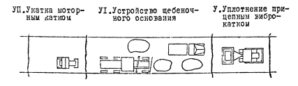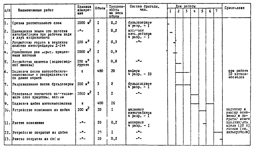 КАРТА Москва - 1980 1. ОБЛАСТЬ ПРИМЕНЕНИЯ1.1. Технологическая карта разработана по заявке треста «Радиострой» и может быть применена также трестом «Межгорсвязьстрой» при строительстве дорог к ОУПам. Технологическая карта разработана в соответствии с «Руководством по разработке типовых технологических карт в строительстве» (ЦНИИОМТП Госстроя СССР, 1976). 1.2. В состав работ, рассматриваемых картой, входят: - разбивка трассы дороги; - планировка поверхности земляного полотна; - устройство корыта и уплотнение его; - устройство подстилающего слоя из песка; - устройство щебеночного основания и верхнего слоя (покрытия). При разработке настоящей ТК использовались материалы проекта РРЛ-8К-11 (заказ 4337). 2. ОРГАНИЗАЦИЯ И ТЕХНОЛОГИЯ СТРОИТЕЛЬНОГО ПРОЦЕССА2.1. К выполнению дорожных работ разрешается приступать после полного обеспечения места работ всеми необходимыми временными дорожными знаками и ограждениями. 2.2. Для разбивки трассы дороги необходимо: - теодолитом произвести выноску оси дороги на местности и обозначить ее металлическими штырями; - металлической лентой произвести разбивку пикетов, закрепить их на расстоянии, равном половине ширины дороги плюс 1 м, деревянными кольями и установить рядом с каждым вешки-сторожки; - произвести нивелирование вертикальных отметок на каждом пикете, на сторожке указывать глубину выемки или высоту насыпи простым карандашом. Контроль за производством земляных работ ведется между пикетами с помощью ходовых визирок и с обязательной последующей проверкой геодезическими инструментами. Контроль за укладкой конструктивных элементов ведется также с помощью ходовых визирок и с обязательной проверкой нивелиром. 2.3. Работы по строительству дороги начинаются с грубой планировки поверхности полотна дороги, создания поперечных и продольных уклонов устройства канавы для отвода поверхностных вод автогрейдером типа Д-710А или Д-144 или бульдозером с универсальным ножом. 2.4. Корыто для дороги устраивается автогрейдером (бульдозером): срезается грунт на глубину по проекту (условно - на глубину 30 см) и ширину больше, чем ширина покрытия на 0,5 м. Дно корыта уплотняется прицепным вибрационным катком. 2.5. Песок для подстилающего слоя подвозится к месту работ на автомобилях-самосвалах ЗИЛ-585 и распределяется автогрейдером Д-144 или бульдозером Д-271 (С-80). Поверхность подстилающего слоя планируется так, чтобы, при прикладывании 3-метровой рейки величина просвета не превышала ± 10 мм. Уплотнение производится прицепным катком или моторным вибрационным катком Д-480 (Д-317Б). Движение транспорта по готовому подстилающему слою запрещается. 2.6. Покрытие из щебня или гравия (нижнего или верхнего слоя), обработанных битумом, способом перемешивания грейдером на дороге производится следующим образом: предварительно разравнивается гравийный материал, перед разливом жидкого битума материал, сложенный в виде валика, разравнивается на ширину несколько меньшую, чем ширина проезжей части (на 0,5 м с каждой стороны). Розлив жидкого битума осуществляется в несколько приемов. При первом розливе назначается небольшая норма расхода битума: до 2,5 л на 1 м2. Перемешивание осуществлять собиранием минерального материала в валик и последующим его разравниванием. Готовая смесь из валика, после проверки ее по качеству и объему, распределяется по проезж