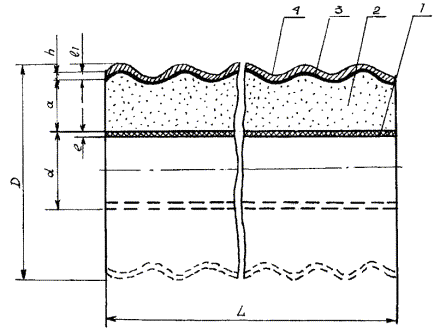 Примечание. Предельные отклонения длин труб «Профлекс» в бухте при длине: до 500 м - до +3 %, более 500 м - до +1,5 %. Рис. 1. Схема конструкции гибких теплоизолированных труб «Профлекс»: 1 - труба ПЭ-х; 2 - пенополиуретан; 3 - полиэтиленовая пленка; 4 - гофрированная полиэтиленовая оболочка 1.4. Справочные показатели свойств теплоизолированных труб «Профлекс» приведены в табл. 2. Таблица 2 Справочные показатели свойств теплоизолированных труб «Профлекс»