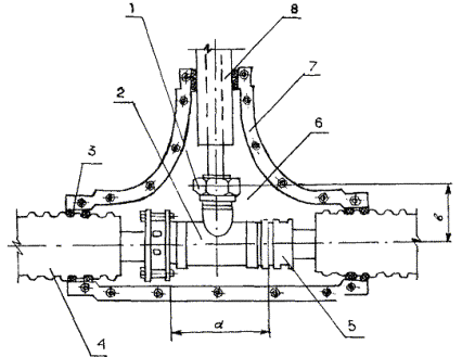 1 - соединение компрессионное из латуни (с зажимной накидной гайкой); 2 - тройник из металла; 3 - резиновые кольца; 4 - труба «Профлекс-1»; 5 - соединение компрессионное из латуни (с зажимной муфтой); 6 - теплоизоляция; 7 - оболочка из стеклопластика; 8 - плечо отвода для «Профлекс-1» Спецификация тройников из латуни для труб «Профлекс-1»