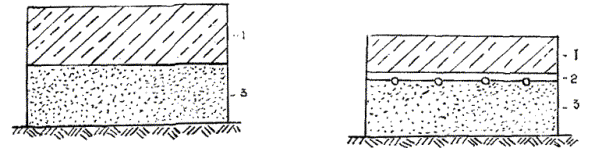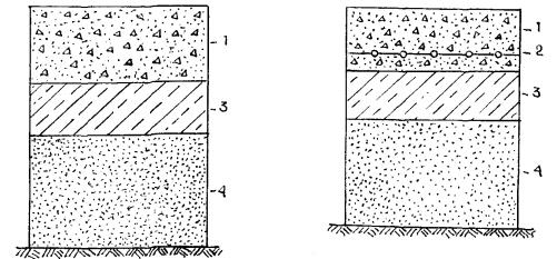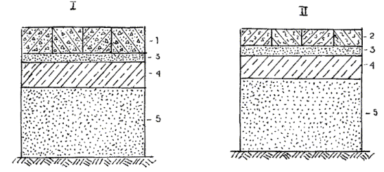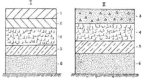 4. КОНСТРУКЦИИ ДОРОГ СО СТАБИЛИЗИРОВАННЫМИ МЕСТНЫМИ ГРУНТАМИ4.1. Местные грунты, стабилизированные органическими, органо-минеральными и полимерными материалами могут быть использованы в городском дорожном строительстве в основаниях дорог, тротуаров, покрытий парковых дорожек взамен щебеночных и песчано-гравийных смесей, малоцементных укатываемых бетонов класса В 7,5. Стабилизаторы могут быть использованы для укрепления грунта, предназначенного для технологического слоя в конструкциях магистральных районных, жилых улиц, дворовых территорий. 4.2. Принципиальные схемы различных конструкций дорог со стабилизированными слоями представлены на рис. 1 - 6. Толщину слоев дорожных конструкций из укрепленных грунтов назначают, исходя из гидрогеологических условий и характера ожидаемого движения в соответствии с проектом. Толщина каждого укрепленного слоя должна быть не менее 10 см и не более 22 см в плотном теле. 4.3. На рис. 1 показаны конструкции магистральных и жилых дорог при двухстадийном строительстве с покрытием из асфальто- и цементобетона. Слой из стабилизированного грунта на первой стадии строительства выполняет роль основания и технологического слоя одновременно. Рис. 1. Принципиальная схема конструкций магистральных районных (I) и жилых (II, III) улиц, устраиваемых при двухстадийном строительстве дорог: 1 - мелкозернистый асфальтобетон; 2 - крупнозернистый асфальтобетон; 3 - цементобетон класса В27,5 из литых смесей; 4 - цементобетон класса В27,5 из литых смесей; 5 - мелкий щебень, высевки; 6 - плиты дорожные железобетонные; 7 - укатываемый малоцементный бетон класса В15; 8 - основание, слой из стабилизированного грунта; 9 - технологический слой из стабилизированного грунта; 10 - песчаный подстилающий слой 4.4. На рис. 2 представлены конструкции магистральных и жилых улиц, построенных в одну стадию с использованием укрепленного грунта. В качестве технологического слоя при этом устраивается основание из малоцементного укатываемого бетона класса В7,5 взамен В15. Для конструкции жилых улиц вместо укатываемого бетона класса В7,5 можно использовать стабилизированное основание из укрепленных грунтов, но при этом толщина слоя должна быть увеличена на 10 %. Толщина основания стабилизированного грунта во всех случаях должна быть не менее 15 см и соответствовать требованиям проекта. Рис. 2. Принципиальная схема конструкций магистральных (I) и жилых улиц (II), устраиваемых в одну стадию: 1 - мелкозернистый асфальтобетон; 2 - крупнозернистый асфальтобетон; 3 - цементобетон класса В27,5 из литых смесей; 4 - малоцементный укатываемый бетон класса В7,5; 5 - технологический слой из стабилизированного грунта; 6 - песчаный подстилающий слой 4.5. При строительстве улиц и дорог местного значения в тяжелых гидрогеологических условиях в конструкциях дополнительно рекомендуется использовать базальтовую сетку и базальтофибробетон, а вместо малоцементного укатываемого бетона класса В7,5 использовать укрепленный грунт (рис. 3). Рис. 3. Принципиальная схема конструкций улиц и дорог местного значения, в т.ч. для благоустройства элитных жилых комплексов, благоустройства объектов соцкультбыта, находящихся в сложных грунтово-гидрогеологических условиях (I), а также при продольных уклонах 40 и более промиль и в местах разрытий (II): 1 - базальтофибробетон класса В27,5 из литой смеси; 2 - осн