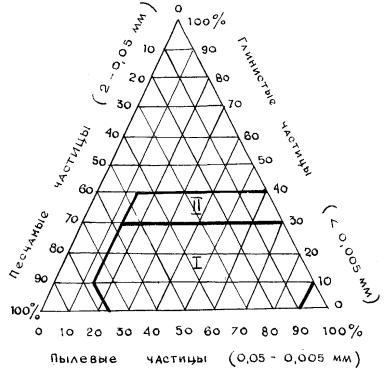 1.4. Настоящие рекомендации предусматривают применение местных грунтов, стабилизированных минеральными, органическими и органо-минеральными реагентами, для устройства основания, подстилающих и технологических слоев дорог, площадок, тротуаров и покрытий парковых дорожек. Для покрытий парковых дорожек используются также полимерные материалы или комплексные на их основе. 1.5. Комплекс технологических операций по укреплению местных грунтов должен обеспечивать необратимую устойчивую связность, прочность и погодоустойчивость (морозостойкость и водостойкость) стабилизированных конструкций. 2. ТРЕБОВАНИЯ К МАТЕРИАЛАМ2.1. Для стабилизации минеральными, органическими, органо-минеральными и полимерными материалами могут быть использованы местные различные грунты, степень пригодности которых определяется их свойствами (табл. 1). 2.2. Для оценки пригодности грунта по гранулометрическому составу можно пользоваться треугольником Фере, в котором выделены зоны, позволяющие прогнозировать получение смесей с заданными свойствами (Приложение 1). Выделенная на треугольнике зона 1 содержит не более 30 % глинистых частиц и обеспечивает наибольшую прочность стабилизированной грунтовой смеси. В зоне 2 содержание частиц с размером зерен меньше 0,005 мм составляет 40 % и позволяет получить заданные свойства смеси. При использовании глинистых грунтов за зоной 2 в смесь следует вводить песчаные фракции. Таблица 1 Классификация грунтов по степени пригодности их для стабилизации минеральными, органо-минеральными и полимерными стабилизаторами