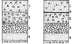 Рис. 2.4. Конструкции поперечных швов сжатия в основании из жестких укатываемых бетонных смесей а, б - швы, устраиваемые в процессе бетонирования; в - шов с нарезкой паза в отвердевшем бетоне; г - рабочий шов 1 - деревянная прокладка; 2 - брус; 3 - паз шва, нарезанный в отвердевшем бетоне и заполненный герметиком; 4 - фиксирующие скобы; 5 - обмазка битумом. Размеры указаны в мм. 3. ОСНОВНЫЕ ТРЕБОВАНИЯ К МАТЕРИАЛАМ, ПРИМЕНЯЕМЫМ В ДОРОЖНЫХ БЕТОНАХ И КОНСТРУКЦИЯХ3.1. Свойства заполнителей, получаемых от переработки бетонных, железобетонных и асфальтобетонных материалов, определяются по стандартным методикам, изложенных в соответствующих нормативных документах: ГОСТ 8269-97*; ГОСТ 8267-93*; ГОСТ 8735-88*; ГОСТ 88736-93*; ГОСТ 25584-90*; ГОСТ 26633-91* и др. 3.2. Физико-механические показатели свойств щебня, применяемого в дорожном строительстве, регламентируются требованиями ГОСТ 8267-93* «Щебень и гравий из плотных горных пород для строительных работ. Технические условия» и не должны быть ниже приведенных в таблице 3.1. 3.3. Щебень, полученный от переработки цементо- и асфальтобетонных конструкций, должен быть разделен на фракции: 5 - 10 мм; 10 - 20 мм; 20 - 40 мм или 5 - 20 мм; 5 - 40 мм; 40 - 70 мм. Допускается использование и других фракций и смесей фракций по согласованию с потребителем. 3.4. Щебень не должен содержать посторонних примесей в виде кирпичного боя, кусков стекла, картона, рубероида, линолеума и другого строительного мусора, а также содержать компоненты и примеси в виде: - серы, сульфидов и сульфатов в пересчете на SО более 1,5 % по массе; - древесных остатков и угля более 1 % по массе; - свободных волокон асбеста более 0,25 % по массе; - водорастворимых хлоридов в пересчете на ионы хлора более 0,1 % по массе. Таблица 3.1. Физико-механические показатели свойств щебня, применяемого в дорожном строительстве
