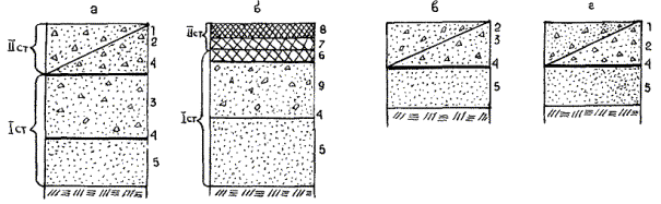 Рис. 2.3. Принципиальные схемы конструкций дорог, тротуаров, площадок с использованием модифицированных резиновыми добавками бетонов: а, б - конструкции магистральных дорог районного значения и внутриквартальных проездов, устраиваемых в две стадии; в - покрытия тротуаров, площадок, отмосток, устраиваемых в одну стадию; г - конструкции дорог на благоустраиваемых территориях у детских садов, школ, больниц, жилых зданий, устраиваемых в одну стадию; 1, 2, 3, 9 - цементобетон В 30 (М 400), В 27,5 (М 350), В 25 (М 300), В 15 (М 200); 4 - полиэтиленовая пленка; 5 - песок; 6, 7 - плотный, пористый асфальтобетон; 8 - высокоплотный, плотный асфальтобетон Таблица 2.5. Ориентировочные толщины конструктивных слоев дорожных одежд с использованием модифицированных резиновыми добавками бетонов