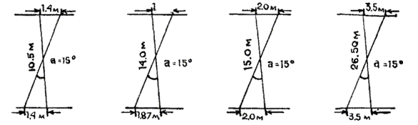 2.9. В конце рабочей смены и при перерыве в бетонировании более 2-х часов в бетонных основаниях устраивают рабочие швы в обмазкой их битумом (рис. 2.4.г.). 2.10. При устройстве дорожных сооружений с цементобетонными покрытиями в основаниях из малоцементного укатываемого бетона поперечные температурные швы устраиваются в соответствии с рекомендациями пп. 2.8., 2.9. Конструкции и схемы расположения швов сжатия приведены на рис. 2.4., расстояния между швами в основаниях приведены в таблице 2.6. 2.11. Швы сжатия нарезаются под углом 15° к ширине проезжей части в соответствии с рисунком.