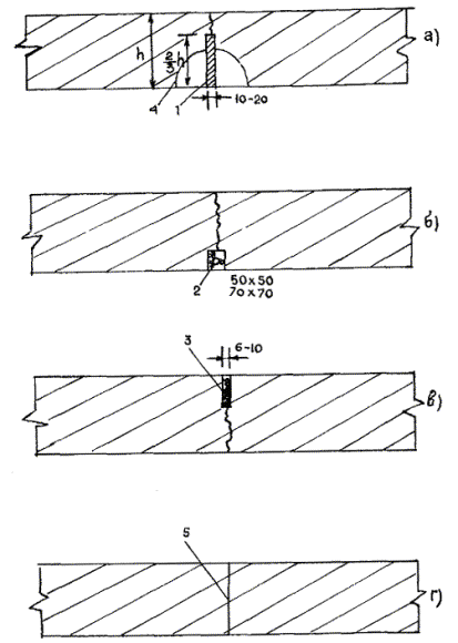 После нарезки швов производят очистку шва сжатым воздухом и заполнение герметиком. Заполнение швов осуществляют в сухую погоду при температуре воздуха не ниже +5 °С. Для заполнения шва могут быть использованы: резино-битумные мастики, РБВ-25, 35, 50; полимерно-битумные мастики, ПБМ-1, ПБМ-2; полимерный герметик; гидром. Таблица 2.6. Расстояния между швами сжатия в метрах