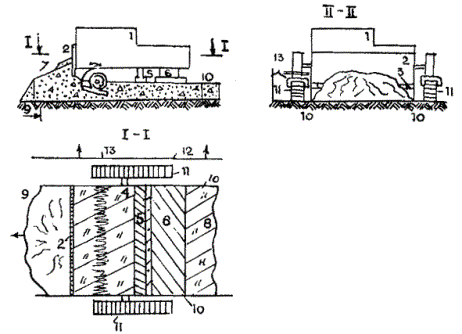 6.16. Применение холодных укатываемых бетонов допускается только при условии, что в течении первых 15 суток твердения бетона его температура не упадет ниже -10 °С, а прочность к моменту замерзания будет не менее 50 кгс/см2. Поэтому укладку слоев асфальтобетонного покрытия рекомендуется производить сразу после уплотнения холодного бетона. 6.17. Устройство оснований и покрытий из укатываемого бетона при положительных и отрицательных температурах наиболее целесообразно осуществлять бетоноукладочными машинами со скользящими формами. 6.18. Современные бетоноукладочные машины со скользящими формами оснащены электронными автоматическими системами обеспечения проектных геометрических параметров бетонного основания и покрытия. Автоматические системы слежения обеспечивают точность движения машины в плане, заданные продольные и поперечные профили, а также толщину укладываемого слоя. Базой автоматической системы слежения является копирная струна, устанавливаемая с одной или двух сторон бетоноукладчика в зависимости от его конструктивных особенностей. 6.19. Копирная струна должна быть строго параллельна оси дороги. Оптимальная высота установки струны над верхом укладываемого слоя 60 - 75 см. Расстояние от струны до продольной грани укладываемого слоя должно быть в пределах 65 - 115 см. Это расстояние обусловлено необходимостью прохода гусеницы машины за пределами укладываемого слоя и длиной консоли с датчиком следящей системы. 6.20. Длина участка с установленной копирной струной должна обеспечивать безостановочную работу укладчика, т.е. быть, как правило, равной длине сменной захватки. Не допускается установка копирной струны участками менее 50 м. Для отладки рабочих органов бетоноукладчика необходимо обеспечить установку копирной струны за 20 м от начала бетонируемой полосы. 6.21. Установка копирной струны включает следующие операции (рис. 6.1.): установку нивелирных колышков; установку металлических стоек и штанг; натяжение копирной струны; контроль качества установки струны. 6.22. Линию установки копирной струны разбивают при помощи теодолита и нивелира. Закрепляют эту линию нивелирными колышками, которые служат высотными реперами и обозначают линию струны в плане. 6.23. Нивелирные колышки устанавливают на расстоянии 65 - 115 см от продольного края плиты так, чтобы линия их вершин соответствовала проектной линии верхней кромки бетонной плиты. Нивелирные колышки определяют отметку, от которой измеряется высота установки струны. Струна в плане размещается точно над нивелирными колышками. Нивелирные колышки на прямолинейных участках улицы устанавливают в начале и в конце участка (в пределах видимости) путем разбивки поперечных профилей. На вертикальных и горизонтальных кривых нивелирные колышки устанавливают у каждой стойки. 6.24. Стойки с поперечными штангами забивают в грунт земляного полотна или песчаный слой (рис. 6.1.) так, чтобы они стояли прочно и строго вертикально на рассеянии около 30 см от линии нивелирных колышков. Расстояние между стойками назначают в диапазоне: максимальное - 8 м - на прямолинейных участках; минимальное - 2 м на горизонтальных кривых радиусом менее 200 м и вертикальных - радиусом менее 1000 м. 6.25. Поперечные штанги (2) при помощи струбцин (3) устанавливают перпендикулярно линии струны так, чтобы прорезь штанги находи