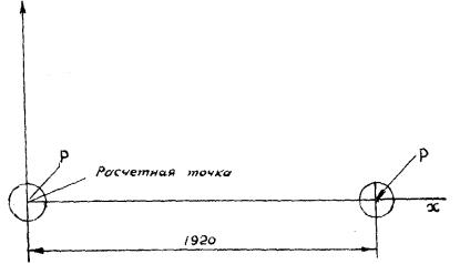 Изгибающий момент М0 от одного колеса, установленного на плите, относящейся к расчетной категории бесконечно больших, равен: М0 = Р (0,0592 - 0,928 × ln l) = 7200 × (0,592 - 0,928 × ln 0,19) = 7200 ((0,592 - 0,0928 × (-1,6607)) = 1535 кг. Определяем влияние второго колеса на величину момента под грузом (рис. 2). При ширине колеи расчетного автомобиля, равной 192 см, приведенные координаты второго колеса составят: Рис. 2. Расчетная схема для определения влияния второго колеса на величину расчетного изгибающего момента