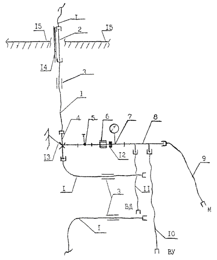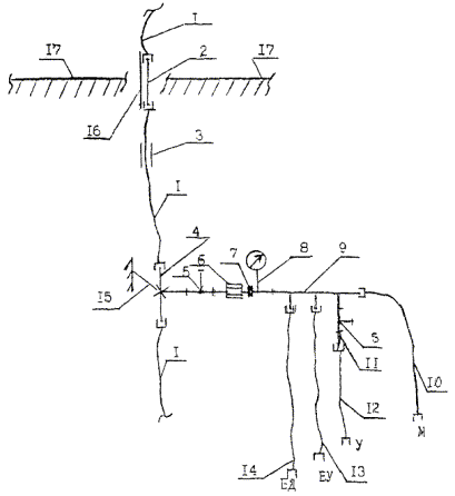 1.7. МПТ, применяемые для водопровода в г. Москве, должны быть сертифицированы: иметь гигиенический сертификат Госсанэпиднадзора РФ или аккредитованных органов сертификации и, как правило, сертификат соответствия Центрального органа сертификации в строительстве Минземжилстрой РФ, или Госстандарта РФ, или аккредитованных ими органов сертификации. 1.8. МПТ должны поставляться в комплекте с латунными соединительными деталями, строго соответствующими по конструкции и размерам своему типу труб по техническим условиям. 2. ОСОБЕННОСТИ ПРОЕКТИРОВАНИЯ ВНУТРЕННЕГО ВОДОПРОВОДА ИЗ МЕТАЛЛОПОЛИМЕРНЫХ ТРУБ2.1. Прокладку водопроводов из МПТ следует предусматривать преимущественно скрытой в плинтусах, штробах, шахтах, каналах (кроме подводок к санитарно-техническим приборам). 2.2. Открытая прокладка водопроводов из МПТ допускается в производственных и складских помещениях, а также в технических этажах, чердаках и подвалах, в местах, где исключается их механическое повреждение. 2.3. При проектировании стояков водопровода из МПТ следует применять трубы диметром 20 и более мм. 2.4. При проектировании разводящих трубопроводов в санитарно-технических узлах следует применять МПТ диаметром 16 и менее мм. 2.5. Присоединение разводящих трубопроводов к водопроводным стоякам следует выполнять через распределительные коллекторы из металла, имеющие два и более отводящих штуцера и установленные на ответвлении из стальных или металлополимерных труб от подающего стояка после шарового вентиля, механического фильтра, поквартирного регулятора давления и водосчетчика. 2.6. При соединении водопроводных стояков из МПТ сантехкабин следует применять междуэтажные вставки из МПТ диаметром, равным диаметру стояка. 2.7. Примерные схемы водопровода из МПТ в санитарно-технических узлах (кабинах) приведены на рис. 1, 2, 3. 2.8. При необходимости выполнения гидравлического расчета водопровода из МПТ следует руководствоваться методическими указаниями свода правил СП-40-102-98. При этом коэффициент эквивалентной равномернозернистой шероховатости следует принимать равным 0,00001 м. Рис. 1. Схема этажестояка из МПТ холодного водопровода с распределительным коллектором в сборе с подводками из МПТ: 1 - подающий стояк из МПТ 2025; 2 - междуэтажная вставка из стальной трубы; 3 - подвижное крепление; 4 - латунный тройник; 5 - вентиль; 6 - фильтр; 7 - поквартирный регулятор давления; 8 - водосчетчик; 9 - распределительный коллектор; 10, 12, 13, 14 - подводки из МПТ 1216 соответственно к смесителю кухонной мойки, к смывному бачку унитаза, к смесителям ванны, умывальника и бидэ; 11 - соединительная деталь; 15 - неподвижное крепление; 16 - стальная гильза; 17 - междуэтажное перекрытие Рис. 2. Схема этажестояка из МПТ горячего водопровода с распределительным коллектором в сборе с подводками из МПТ: 1 - подающий стояк из МПТ 2025; 2 - междуэтажная вставка из стальной трубы; 3 - подвижное крепление; 4 - латунный тройник; 5 - вентиль; 6 - фильтр; 7 - водосчетчик; 8 - распределительный коллектор; 9, 10, 11- подводки из МПТ 1216 соответственно к смесителям кухонной мойки, ванны и умывальника, бидэ; 12 - поквартирный регулятор давления; 13 - неподвижное крепление; 14 - стальная гильза; 15 - междуэтажное перекрытие Рис. 3. Схема этажестояка из МПТ с междуэтажной вставкой из МПТ: 1 - междуэтажная вставка из МПТ 2025; 2 - латунный тройник; 3 - вентиль; 4 - неподвижное