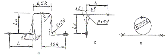 где d - наружный диаметр МПТ, мм Рис. 4. Устройство компенсаторов: а - П-образного, б - L-образного, в - петлеобразного 2.16. Радиус изгиба Г-, Z- и П-образного компенсатора следует принимать равным ~ 5d, диаметр петлеобразного компенсатора следует принимать равным 10d. 2.17. При расстановке на трубопроводе из МПТ скользящих креплений расстояния между ними следует принимать при горизонтальном расположении труб диаметром до 20 мм - 500 мм, более 20 мм - 750 мм, при вертикальном - соответственно 1000 и 1200 мм. 2.18. При расстановке креплений расстояние от неподвижных опор до стен должно быть не менее двух диаметров МПТ. 2.19. Запорную и водоразборную арматуру, устанавливаемую на водопроводе из МПТ, следует независимо жестко закреплять к строительным конструкциям (к санитарным приборам). 2.20. Проход водопровода из МПТ через строительные конструкции следует выполнять в гильзах из металла или пластмасс. 2.21. Пересечение перекрытий стояками водопровода из МПТ должно выполняться с помощью гильз из стальных труб, выступающих над перекрытием на высоту не менее 50 мм. 2.22. Водопроводы из МПТ (кроме подводок к санитарным приборам) должны быть теплоизолированы современными теплоизоляционными материалами (изделиями) с коэффициентом теплопроводности не более 0,05 Вт/м°С. Толщина теплоизоляционного слоя должна составлять не менее 10 мм. 3. ТРАНСПОРТИРОВКА И ХРАНЕНИЕ МЕТАЛЛОПОЛИМЕРНЫХ ТРУБ3.1. Бухты металлополимерных труб транспортируют любым видом транспорта в соответствии с требованиями перевозки грузов, действующими на данном виде транспорта. 3.2. Транспортировка, погрузка и разгрузка металлополимерных труб в бухтах должна осуществляться при температуре наружного воздуха не ниже -20 °С. При погрузо-разгрузочных работах, транспортировании, хранении бухты металлополимерных труб необходимо оберегать от механических повреждений. Запрещается сбрасывать бухты или отрезки металлополимерных труб с транспортных средств. При разгрузке МПТ подъемно-транспортными средствами запрещается применять металлические тросы и захваты. 3.3. Металлополимерные трубы в бухтах следует хранить в закрытом помещении в горизонтальном положении на стеллажах высотой не более 2 м и на расстоянии не менее 1 м от нагревательных приборов, а в условиях строительной площадки - в закрытом помещении или под навесом, оберегая от прямых солнечных лучей, попадания масел, жиров и нефтепродуктов. 4. ОСОБЕННОСТИ МОНТАЖА ВНУТРЕННЕГО ВОДОПРОВОДА ЗДАНИЙ ИЗ МЕТАЛЛОПОЛИМЕРНЫХ ТРУБ4.1. Монтаж водопроводов из МПТ должен осуществляться по монтажному проекту, выполненному строительно-монтажной или проектной организацией. 4.2. Работы по монтажу МПТ должны выполняться специально обученным техническим персоналом, имеющим удостоверение на право проведения работ с МПТ. 4.3. Монтаж трубопроводов из МПТ должен осуществляться при температуре окружающей среды не менее +10 °С. 4.4. Бухты МПТ, хранившиеся или транспортировавшиеся на монтаж (заготовительный участок) при температуре ниже 0 °С, должны быть перед раскаткой выдержаны в течение 24 часов при температуре не ниже 10 °С. 4.5. В процессе размотки бухт и монтажа трубопроводов необходимо следить, чтобы маркировка на МПТ находилась на одной образующей поверхности трубы. Прокладку трубы следует вести без натяга, свободные концы закрывать заглушками во избежание попадания гряз