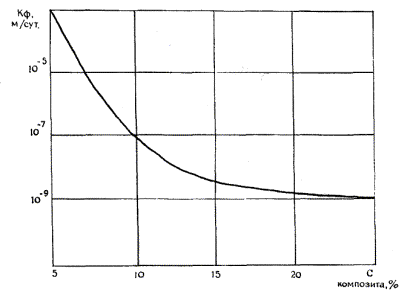 2.4. В качестве добавок используются полиакриламид (ПАА), карбоксиметилцеллюлоза (КМЦ), кальцинированная сода. 2.5. В качестве наполнителя могут быть использованы пески, супеси, суглинки и их смеси, а так же другие неорганические заполнители для строительных работ. 2.6. Гидроизоляционный композит может использоваться в сухом виде (засыпка, послойная укладка с перемешиванием) и в виде гелеобразных паст (нагнетание, заполнение закрытых полостей и др.). 2.7. Содержание композита в сухом виде определяется только требованиями, предъявляемыми к коэффициенту фильтрации (5 - 25 %) в соответствии с ГОСТ 25584-90. 2.8. Зависимость между водопроницаемостью композиций и содержанием в них актибента (ПМК) показана на рис. 1. 2.9. Содержание композита в гелеобразных пастах, предназначенных для нагнетания за обделочное пространство тоннелей, определяется как нормативами по коэффициенту фильтрации, так и пластичностью смеси. Пасты для нагнетания должны обладать свойствами, обеспечивающими возможность транспортировки их под давлением. 2.10. Область пластичного состояния, показанная на рис. 2, обеспечивает надежную гидроизоляцию и рекомендуется к использованию. При увеличении количества воды или уменьшении содержания наполнителя материал переходит в текучее состояние, что снижает его противофильтрационные свойства. При уменьшении количества воды или увеличении содержания наполнителя вязкость пасты резко возрастает, она переходит в полутвердое состояние и нагнетание состава становится невозможным. Рис. 1. Зависимость водонепроницаемости композиции от содержания водонабухающего композита Рис. 2. Реологические свойства гидроизоляционной пасты в зависимости от соотношения композит 2.11. Содержание исходных материалов в композите указывается в технологическом регламенте, разрабатываемом для каждого конкретного объекта. 2.12. Композит должен соответствовать требованиям, указанным в таблице 1. Таблица 1
