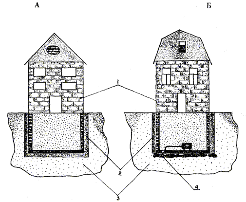 2.13. Коэффициент фильтрации определяется по ГОСТ 25584-90. 2.14. Свободное набухание определяется по ГОСТ 24143-80. 2.15. Насыпная плотность определяется по ГОСТ 9758-86. 3. ПРАВИЛА ПРИМЕНЕНИЯГидроизоляционный композит (ПМК) применяется для изготовления насыпных противофильтрационных экранов и завес путем засыпки, плотной укладки или нагнетания под давлением (в виде пасты) в местах поступления грунтовых или паводковых вод в подземную часть зданий или инженерных сооружений, а также для предотвращения фильтрации воды (раствора) как внутрь, так и наружу из котлованов или водоемов различного назначения. Существуют следующие технологии применения гидроизоляционного композита: 3.1. Противофильтрационная защита и гидроизоляция подземной части строящихся зданий и инженерных сооружений. 3.1.1. Создание противофильтрационного экрана вокруг подземной части строящегося здания или инженерного сооружения состоит из следующих этапов работ: - изготовление горизонтального поля экрана; - изготовление вертикальных полей экрана; - замыкание противофильтрационного экрана. 3.1.2. Изготовление горизонтального поля противофильтрационного экрана подземного сооружения состоит в укладке на дно котлована плотно прикатанного слоя из гидроизоляционного композита толщиной около 100 мм. При этом слой композита укладывается так, чтобы занимаемая площадь несколько превышала площадь пола сооружения для последующего примыкания к гидроизоляционному экрану вокруг стен (рис. 3, вид А). 3.1.3. Изготовление вертикальных полей противофильтрационного экрана производится в ходе их возведения путем засыпки между стеной и грунтом гидроизоляционного композита. В процессе засыпки слои смеси в местах их примыкания к горизонтальному полю гидроизоляционного экрана следует уплотнять. После завершения работ по изготовлению вертикальных полей экрана вместе с горизонтальным полем, вокруг сооружения образуется единый противофильтрационный экран (оболочка) (рис. 3, вид А). 3.1.4. Для предотвращения выхода его на поверхность композита при его набухании вокруг здания необходимо устраивать прочную отмостку. 3.2. Противофильтрационная защита и гидроизоляция реконструируемых зданий и инженерных сооружений. 3.2.1. Гидроизоляция зданий или инженерных сооружений в процессе их ремонта или реконструкции выполняется или методом укладки (засыпки) с уплотнением, или методом нагнетания пасты из гидроизоляционного композита (рис. 3, вид Б). 3.2.2. Укладка композита, описания в разделе 3.1, применяется в том случае, когда имеется доступ к протекающей части здания или сооружения. В противном случае применяется метод инъекций (нагнетания). Гидроизоляционная паста в этом случае готовится в агрегате типа СО-180. Рис. 3. Устройство гидроизоляции подземной части строящегося (А) или реконструируемого (Б) здания (инженерного сооружения) 3.2.3. Создание противофильтрационных завес методом инъекций (нагнетания) состоит в следующем: - подготовка объекта для нагнетания гидроизоляционного состава; - приготовление гидроизоляционного состава; - нагнетание гидроизоляционного состава за обделку сооружения; - проверка качества гидроизоляции и контрольные нагнетания. 3.2.4. Подготовка объекта является наиболее важным этапом работ при создании противофильтрационных завес в реконструируемых зданиях или инженерных сооружен