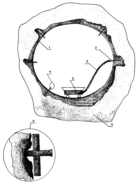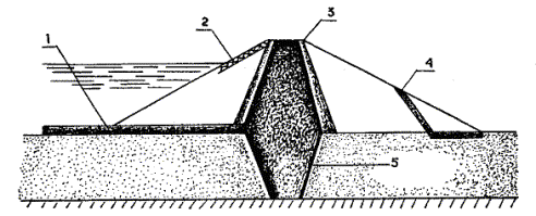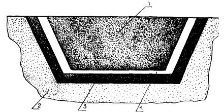 Рис. 6. Противофильтрационный экран (ПФЭ) котлована для утилизации твердых бытовых отходов (БТО): 1 - отходы БТО; 2 - грунт; 3 - экран (ПФЭ); 4 - защита экрана 4.2. Каждая партия должна сопровождаться документом (паспортом), в котором указывается: - наименование предприятия-изготовителя; - наименование продукции и ее соответствие ТУ 5775-002-17700486-00; - номер и дата выдачи документов; - масса партии нетто; - номер партии; - результаты испытаний; - наименование и адрес потребителя. 4.3. Отбор проб для испытаний производится от каждой партии композита в соответствии с требованиями СТ СЭВ 3477-81. 4.4. Результаты испытаний изготовитель обязан сообщить потребителю по его требованию. 4.5. Заказчик имеет право проводить контрольную проверку качества изготовленного композита и соответствия его ТУ 5775-002-17700486-00. 4.6. Контрольную проверку качества проводят в срок не позднее одного месяца со дня изготовления композита: - наименование предприятия-изготовителя; - наименование и назначение продукции; - массу нетто; - обозначение технических условий; - артикул; - номер партии; - дату изготовления; - гарантийный срок хранения; - способ применения; - надписи «Беречь от влаги» и «Не бросать». 5. ТРЕБОВАНИЯ БЕЗОПАСНОСТИ5.1. По степени воздействия на организм человека композит относится к 4 классу (малоопасные вредные вещества) в соответствии с классификацией ГОСТ 12.1.007-76*. 5.2. Композит пожаровзрывобезопасен. 5.3. Процессы производства и применения композита должны осуществляться в соответствии с требованиями ГОСТ 12.3.002-75*, а погрузочно-разгрузочные работы - в соответствии с требованиями ГОСТ 12.3.009-76*. 5.4. Технологический процесс необходимо осуществлять при максимально достижимой герметичности оборудования. 5.5. Контроль за содержанием загрязняющих веществ в воздухе рабочей зоны должен проводиться в соответствии с требованиями ГОСТ 12.1.005-88. 5.6. При работе с композитом необходимо использовать спецодежду, спецобувь, средства защиты рук и органов дыхания в соответствии с требованиями ГОСТ 12.4.034-75* и ГОСТ 12.4.103-75*. 5.7. Помещения, в которых изготавливают композит, должны быть оборудованы приточно-вытяжной вентиляцией в соответствии с требованиями ГОСТ 12.4.021-75*. 6. ТРЕБОВАНИЯ ОХРАНЫ ОКРУЖАЮЩЕЙ СРЕДЫ6.1. Производство композита должно быть безотходным. 6.2. Композит в процессе применения при наличии других веществ или факторов токсичных соединений не образует, вредного воздействия на организм человека не оказывает. 6.3. При производстве композита должен быть организован постоянный контроль за соблюдением предельно допустимых выбросов (ПДВ) в соответствии с требованиями ГОСТ 17.2.402-81. 6.4. Суммарная удельная эффективная активность естественных радионуклидов Аэфф исходных материалов не должна превышать 370 БК/кг. 7. ГАРАНТИИ ИЗГОТОВИТЕЛЯ7.1. Предприятие-изготовитель гарантирует соответствие композита требованиям ТУ 5775-002-17700486-99 при соблюдении правил хранения и транспортирования. Приложение 1ПЕРЕЧЕНЬ