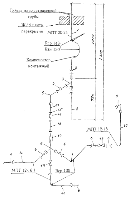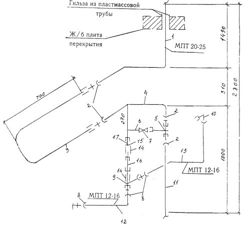 1.4. Для монтажа водопроводных подводок рекомендуется применять металлополимерные трубы наружным диаметром 16 мм. Размеры и масса труб приведены в таблице 1. Рис. 1. Схема холодного водоснабжения из МПТ: 1 - подающий стояк МПТ; 2, 6 - ниппель; 3 - тройник переходный ч.к.; 4 - 13 - вентиль запорный муфтовый; 5 - угольник Н-В; 7 - угольник установочный Н-В; 8 - труба МПТ; 9 - коллектор латунный; 10 - подводка МПТ к смесителю ванны; 11 - подводка МПТ к смывному бачку унитаза; 12 - подводка МПТ к смесителю мойки; 14 - муфта короткая; 15 - контргайка; 16, 17 - вставки под счетчик расхода воды и РД; 18 - кран со шлангом (квартирное первичное устройство пожаротушения по СНиП 2.08.01-89, изм. № 4) Рис. 2. Схема горячего водоснабжения из МПТ: 1 - подающий стояк МПТ; 2, 8 - ниппель; 3 - полотенцесушитель; 4 - труба МПТ; 5 - тройник переходный ч.к.; 6 - угольник Н-В; 7 - вентиль запорный муфтовый; 9 - тройник ч.к.; 10 - угольник установочный Н-В; 11 - труба МПТ; 12 - подводка МПТ к кухонной мойки; 13 - подводка МПТ к смесителю ванны и умывальника; 14 - муфта короткая; 15 - контргайка; 16, 17 - вставки под счетчик расхода воды и РД. Таблица 1 Размеры и масса металлополимерных труб для водопроводных подводок Размеры в мм