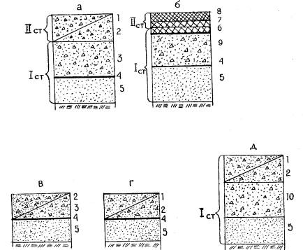 1.8. При стадийном строительстве на 1-й стадии дороги используются для проезда построечного транспорта и тяжелых строительных машин в процессе проведения работ по инженерному благоустройству жилой застройки и зданий соцкультбыта. На 2-й стадии после окончания всех строительных работ по возведению зданий устраивают постоянные внутриквартальные дороги, которые используются для пропуска транспорта, обслуживающего жителей района. 1.9. На первой стадии работ устраивают: - водосток и инженерные коммуникации; - вертикальную планировку; - земляное полотно; - песчаный подстилающий слой; - основание (на период строительства покрытие) из бетона марки 300 (класс В25), если движение построечного транспорта осуществляется непосредственно по бетону, или крупнозернистый слой асфальтобетона, уложенный на основание из бетона марки 200 (В15); - грунтовые обочины шириной не менее 1 м. 1.10. Вторая стадия включает: - очистку и ремонт основания (покрытия); - установку бортовых камней; - устройство прослойки из базальтовой сетки, отсевов дробления или крупнозернистого песка; - устройство верхних слоев покрытия. 2. КОНСТРУКЦИИ УЛИЦ И ДОРОГ РАЗЛИЧНОГО НАЗНАЧЕНИЯ С ИСПОЛЬЗОВАНИЕМ РАЗЛИЧНЫХ ОТХОДОВ ПРОМЫШЛЕННОСТИ2.1. Улицы и дороги различных категорий с цементобетонным покрытием, в конструктивных слоях которых используются материалы от переработки цементно- и асфальтобетонных конструкций, изношенных автопокрышек и геотекстиль должны строиться с учетом требований проектов СК 6101-97, СК 6117-00 и настоящих технических рекомендаций. 2.2. Варианты конструкций улиц и дорог различного назначения, устраиваемых в одну и две стадии с использованием продуктов переработки бетонных, асфальтобетонных конструкций и изношенных покрышек в бетонах классов В27,5; 25; 15 и В7,5, представлены на рис. 2.1. При неблагоприятных гидрогеологических условиях дорнит укладывают по земляному полотну. Использование дорнита при благоприятных гидрогеологических условиях позволяет уменьшить толщину песчаного подстилающего слоя. 2.3. Подстилающий слой устраивают из природного песка, а также с частичной или полной его заменой на песок, полученный от переработки цементно- и асфальтобетонных конструкций, который должен отвечать требованиям ГОСТ 8736-93. 2.4. Конструкции, предназначенные для движения построечного транспорта, а также магистральные районного значения и внутриквартальные дороги рассчитывают на автомобильную нагрузку Н-30; конструкции, устраиваемые при благоустроительных работах у жилых зданий и учреждений соцкультбыта, а также тротуаров и отмосток - на Н-10. Рис. 2.1. Конструкции дорог, тротуаров, площадок с использованием продуктов переработки бетонных, асфальтобетонных конструкций, изношенных автопокрышек, дорнита; а, б - конструкции магистральных дорог районного значения и внутриквартальных проездов, устраиваемых в две стадии; в - конструкции магистральных дорог районного значения и внутриквартальных проездов, устраиваемых в одну стадию; г - покрытия тротуаров площадок, отмосток, устраиваемых в одну стадию; д - конструкции дорог на благоустраиваемых территориях у детских садов, школ, больниц, жилых зданий, устраиваемых в одну стадию 1, 2, 3, 9, 10 - бетоны М400 (В30), М350 (В27,5), М300 (В25), М200 (В15); М100 (В7,5); 4 - полиэтиленовая пленка; 5 - песок; 6, 7 - крупнозернистый асфальтобетон; 8 - мелкозернистый асфальто