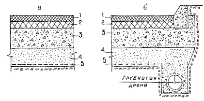 3. ТЕХНОЛОГИЯ СТРОИТЕЛЬСТВА3.1. При устройстве в дорожной конструкции прокладок из геотекстильных материалов следует тщательно выполнить следующие операции: - подготовку поверхности, на которую укладывается геотекстильный материал; - укладку и закрепление геотекстильного материала. 3.2. При укладке геотекстильного материала на грунт земляного полотна (рис. 3.1.а) работы по выполнению указанных операций начинаются только после окончания строительства подземных сооружений и коммуникаций, после засыпки всех предшествующих разрытии и уплотнения грунта до требуемого значения коэффициента уплотнения (Ктр.упл. = 0,98). 3.3. Подготовка земляного полотна предусматривает планировку грунта в проектных отметках с обязательным выдерживанием заданных продольных и поперечных уклонов. 3.4. При устройстве геотекстильной прокладки между слоями временных дорог (рис. 3.2) необходимо подготовить нижний, песчаный подстилающий слой. После его отсыпки по земляному полотну, планировки и уплотнения следует оценить точность соблюдения поперечного профиля. 3.5. Геотекстильные ткани к месту укладки доставляется в рулонах, которые распределяются вдоль участка производства работ на расстоянии друг от друга, кратном длине ткани в рулоне. Если по ширине проезжей части геотекстиль укладывается в несколько полотен, в этом случае на каждой точке распределения оставляется соответствующее количество рулонов. 3.6. Укладку геотекстильной ткани начинают с низовой стороны. Вначале раскатывают рулон вдоль бортового камня или кромки проезжей части, а затем с перекрытием швов - последующие рулоны. Рулон геотекстильной ткани раскатывается вручную с перекрытием смежных полос на 10 - 20 см. В поперечном направлении полотна стыкуются внахлест с перекрытием не менее 20 см. 3.7. При стыковке смежных полотен геотекстильного материала внахлест с перекрытием швов, соединение укрепляется П-образными скобами, вбиваемыми через разложенный материал в грунт или песок через 2 - 2,5 м вдоль линии шва. Скобы изготавливаются из арматурной стали диаметра 3 - 5 мм, длиной 10 - 15 см. При таком соединении полотен закрепление соединений может производиться клеящими водостойкими материалами. При соединении полотен встык могут быть использованы сварка и сшивание портативными машинками. Перед укреплением соединений полотен необходимо провести разравнивание полотен, если при их раскатывании образовались складки, волны, пузыри. 3.8. Отсыпку слоя дорожной одежды, следующего за прокладкой из геотекстильного материала, производят по способу «от себя» без заездов автомобилей-самосвалов на разложенные и скрепленные полотна геотекстиля. После перемещения и планировки бульдозером или автогрейдером насыпного материала, производится его уплотнение с применением гладковальцовых катков и катков на пневмошинах. Применять катки вибрационного действия запрещается. 3.9. При строительстве постоянных дорог на переувлажненных грунтах применяется дорожная конструкция, под которой по земляному полотну геотекстильный материал укладывается с уклоном в сторону продольного дренажа рис 3.1.б. Полотно геотекстиля выпускается в сторону дренажной канавки и укладывается вдоль ее стенок с обертыванием продольной трубчатой дрены. 3.10. Геосетки при использовании в качестве упругой прокладки под бетонным основанием