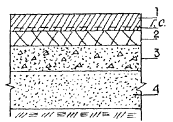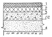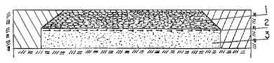 в) геосетка располагается под верхним слоем асфальтобетонного покрытия укладывается по нижнему слою покрытия Рис. 3.3. Варианты размещения геосеток в дорожной конструкции: 1 - верхний слой асфальтобетонного покрытия; 2 - нижний слой асфальтобетонного покрытия; 3 - бетонное основание; 4 - песчаный подстилающий слой; Г.С. - геосетка 3.13. При использовании геосеток под верхним слоем асфальтобетонного двухслойного покрытия (это решение чаще всего используется на остановках городского общественного транспорта) раскладка отдельных полотнищ производится также с перекрытием смежных полос и со стыковкой в поперечном направлении внахлест. Перекрытие стыкуемых полотен должно составлять 10 - 20 см. Раскатке рулонов геосетки предшествует розлив 50 %-ой битумной эмульсии с расходом 0,4 - 0,6 кг/м2. Эмульсия разливается после остывания асфальтобетона нижнего слоя (в теплое время через 4 - 5 ч после укладки). Раскладка геосетки выполняется сразу после разлива эмульсии, не дожидаясь ее распада. После распада эмульсии геосетка должна прилипнуть к нижнему слою асфальтобетона и ее дополнительно закрепляют П-образными скобами в местах стыковки. После окончательного распада эмульсии можно приступать к устройству верхнего слоя асфальтобетонного покрытия, используя асфальтоукладчики на колесном ходу. Как и в случае, рассматриваемом в п. 3.12, не следует производить обрубку кромок асфальтобетона пневмоинструментом и следует принять меры для уменьшения пути проезда автомобилей-самосвалов, доставляющих асфальтобетонную смесь по ранее уложенной и закрепленной геосетке; желательно устраивать боковые заезды для автомобилей. 4. КОНТРОЛЬ КАЧЕСТВА.4.1. Контроль качества выполнения строительных работ в конструкциях с применением прокладок из геотекстильных материалов или геосеток производится по действующим техническим нормативам СНиП 3.06.03-85 «Автомобильные дороги» и ТР 103-00 «Технические рекомендации по устройству дорожных конструкций с применением асфальтобетона». К общим требованиям указанных нормативов добавляются требования по качеству устройства прослоек из геотекстильных материалов или геосеток, а именно: качество применяемых материалов; ровность раскладки применяемых материалов, исключение образования складок, волн, пузырей; качество заделки мест, где имели место разрывы или другие нарушения сплошности в уложенных полотнищах геотекстиля или геосетки; ширина перекрытия смежных полотен и качество стыковки полотен вдоль участка укладки; шаг и прочность соединения полотен скобами в местах примыкания. 4.2. Приемку соответствующего слоя дорожной одежды с устроенной по нему прокладкой из геотекстильной ткани или геосетки производят путем наружного осмотра с составлением акта приемки. 5. ТЕХНИКА БЕЗОПАСНОСТИ5.1. При производстве дорожно-строительных и ремонтных работ с применением геотекстильных материалов и геосеток следует соблюдать требования строительных норм и правил по технике безопасности в строительстве, изложенных в СНиП III-4-80 «Техника безопасности в строительстве», а также правила безопасности и производственной санитарии, изложенные в «Правилах по охране труда в дорожном хозяйстве» М. Стройиздат 1989. СОДЕРЖАНИЕ