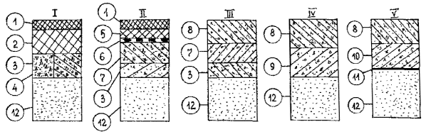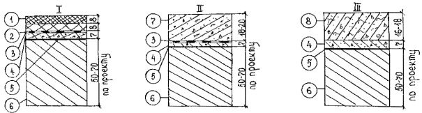Примечание. Принятые обозначения: Rизграст. - прочность на растяжение при изгибе; Eизг. - модуль упругости при 0 °С. Рис. 2.1. Конструкции дорожных одежд в зоне искусственных сооружений на жестком (скальном) основании. 1 - асфальтобетон высокоплотный или плотный тип А по ГОСТ 9128-97; 2 - асфальтобетон крупнозернистый плотный тип II по ТУ 400-24-107-91*, пористый по ГОСТ 9128-97; 3 - базальтовая сетка по битумной эмульсии; 4 - выравнивающий слой из тяжелого мелкозернистого бетона; 5 - битумная эмульсия; 6 - несущая железобетонная плита с коэффициентом постели близким к скальному основанию (по типу Лефортовского тоннеля); 7 - монолитный бетон (В40, F200 в солях, W12, B < 5 %); 8 - монолитный фибробетон (В40, F200 в солях, W12, B < 5 %). Примечание: размеры указаны в см. Рис. 2.2. Дорожные конструкции для мостовых переходов с металлическими пролетными строениями 1 - литой асфальтобетон тип I, II по ТУ 400-24-58-89*; 2 - асфальтобетон крупнозернистый пористый или высокопористый по ГОСТ 9128-97; 3 - гидроизоляционная мастика типа «Битрек» по битумной эмульсии; 4 - сероасфальтобетон по ТУ 5718-002-53737504-01; 5 - асфальтобетон мелкозернистый тип А по ГОСТ 9128-97*; 6 - асфальтобетон крупнозернистый тип Б по ГОСТ 9128-97*; 7 - металлическое пролетное строение. Примечание: размеры указаны в см. Рис. 2.3. Варианты конструкций дорожных одежд на упругом основании 1 - асфальтобетон мелкозернистый высокоплотный, плотный тип А по ГОСТ 9128-97; 2 - монолитная плита из асфальтобетона крупнозернистого плотного типа II по ТУ 400-24-107-91*; 3 - малоцементный укатываемый бетон В7,5 (М100); 4 - уплотняемая щебеночная крупнозернистая смесь тип I по ТУ 400-24-150-86; 5 - асфальтобетон крупнозернистый, плотный тип Б по ГОСТ 9128-97*; 6 - базальтовая сетка по битумной эмульсии; 7 - бетон из литых или пластичных смесей В22,5 (М300), F150 в солях; 8 - бетон из литых или жестких смесей В30 (М400), F200 в солях; 9 - малоцементный укатываемый бетон В15 - В22,5 (М200 - М300), F150 в солях с укладкой двумя равными слоями; 10 - фибробетон из литых смесей В22,5 (М300), F150 в солях; 11 - полиэтиленовая; пленка или пергамин или другой пленочный материал; 12 - песок с коэффициентом фильтрации не менее 4 м/сутки. 2.2. КОНСТРУКЦИИ ДОРОЖНЫХ ОДЕЖД СКОРОСТНЫХ АВТОМАГИСТРАЛЕЙ В ЗОНЕ ИСКУССТВЕННЫХ СООРУЖЕНИЙ НА ЖЕСТКОМ ОСНОВАНИИ2.2.1. Под жестким основанием подразумеваются тоннели, эстакады, мосты, выполненные из высокопрочных железобетонных конструкций, коэффициент постели которых приближается к скальному основанию и составляет более 1000 кг/см3. В этом случае модуль упругости конструктивных слоев дорожных одежд уменьшается не сверху вниз, как это принято для конструкций на упругом основании, а снизу вверх. На рис. 2.1 показаны принципиальные схемы таких конструкций. 2.2.2. Учитывая особенности работы таких конструкций общую толщину асфальтобетонного покрытия следует принимать не менее 16 см (рис. 2.1.). Для асфальтобетонного или бетонного покрытия (рис. 2.1 - I, II) с целью уменьшения влияния разности деформаций с основанием выравнивающий слой из тяжелого мелкозернистого бетона класса по прочности В25 - В27,5 следует укладывать по слою битумной эмульсии, а между покрытием и выравнивающим слоем укладывать базальтовую сетку с размером ячеек 25´25 мм по битумной эмульсии. 2.2.3. При применении в покрытии монолитного фибробетона (рис. 2.1, III) базальтовая сетка может не укладываться, а толщина покрытия уменьшается до 18 - 20 см (по расчету). 2.2.4. На мостовых пе