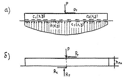 Третье условие статики (сумма моментов всех сил относительно края плиты должна быть равна нулю) соблюдается, если внешний изгибающий момент, образованный парой сил PT и RC, компенсируется моментом сил P и Rp, что возможно только при смещении равнодействующей вертикальной реакции Rp по оси абсцисс (рис. 1.б). Рис. 1.а, б. Расчетная схема плиты на упругом основании под действием заторможенного (блокированного без проскальзывания) колеса автомобиля (а) и эквивалентная схема (б). Для введения в расчет некоторого тормозного усилия необходимо произвести преобразование исходной расчетной схемы таким образом, чтобы, изменив сочетания прикладываемой внешней нагрузки, сохранить неизменной вертикальную реакцию упругого основания, т.е. P(x, y) = const. Равнодействующая горизонтальной реакции основания RC и тормозное усилие PT образуют пару сил с плечом равным толщине плиты hпл., которую можно заменить эквивалентным изгибающим моментом M (рис 2.а). Изгибающий момент M можно заменить фиктивной парой сил P1 и P2 равных между собой по модулю, противоположно направленных и действующих в вертикальной плоскости (рис. 2.б). Рис. 2.а, б. Фиктивные расчетные схемы плиты на упругом основании для определения внутренних усилий от воздействия вертикальной и горизонтальной нагрузок в местах усиленного влияния транспортных нагрузок. Таким образом, условием эквивалентности исходной и конечной расчетных схем является равенство изгибающих моментов, т.е. M = PThпл и M = P12Δx, где /P1/ = /P2/, PT = φP, в итоге получаем