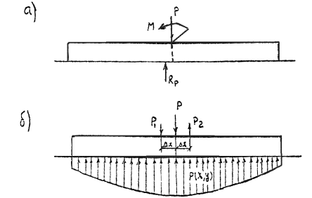 вертикальной и горизонтальной нагрузок. Здесь вертикальная нагрузка P вызовет вертикальную реакцию упругого основания