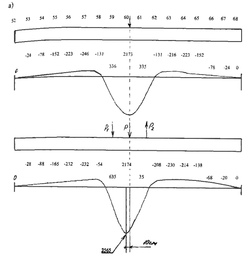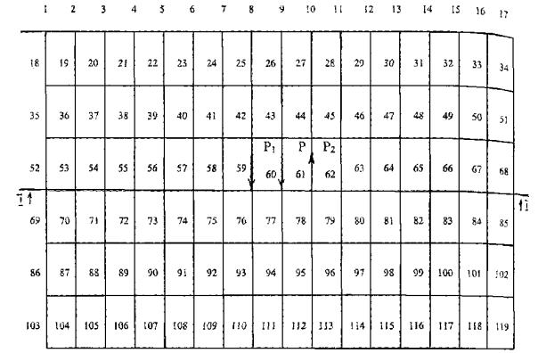 В полученной зависимости величина Δx, обозначающая расстояние между силами P1, P и P, P2, не должна превышать диаметр отпечатка следа колеса автомобиля, потому что тормозное усилие, так же как и вертикальная нагрузка от массы транспортного средства передается на покрытие дорожной одежды посредством колеса. С целью определения влияния тормозного усилия на работу дорожной одежды была рассчитана экспериментальная конструкция, представляющая собой железобетонную плиту 2П60.18 с размером 6,0´1,75´0,14 м3 на песчаном основании. В расчете использовались следующие исходные данные: модуль упругости плиты E = 330000 МПа, коэффициент Пуассона плиты μ = 0,16, модуль деформации основания E0 = 35 МПа (что соответствует коэффициенту постели К = 4,0), коэффициент Пуассона основания μ = 0,30. Расчет производился по разработанной в НИИМосстрое методике определения прогибов и изгибающих моментов в плите на упругом основании с коэффициентом постели (модель Винклера), которая основывается на использовании метода конечных разностей. Методика позволяет производить расчет плит любой конфигурации и жесткости от любых произвольно приложенных одиночных и комбинированных нагрузок с учетом кручения, переменных величин жесткости и температуры с соблюдением всех граничных условий и размеров плит. Метод основан на замене дифференциальных уравнений соответствующими уравнениями в конечных разностях, т.е. введении конечных разностей вместо дифференциалов. С этой целью поверхность плиты конечных размеров разбивается на равные прямоугольники, образующие упругую сетку, и чем больше число узловых точек сетки, тем больше неизвестных перемещений, тем точнее полученные результаты. Составление уравнений в конечных разностях изгиба плиты на упругом основании для всех узлов упругой сетки в пределах контура плиты, а также граничных условий, обеспечивает составление матрицы алгебраических линейных уравнений, необходимых для определения величин неизвестных прогибов, а затем и изгибающих моментов. Решение системы уравнений осуществляется методом Гаусса или другими известными методами. Этапы расчета: - составление уравнений прогиба плиты в конечных разностях для всех узловых точек в контуре плиты; - составление уравнений граничных условий; - проверка полученных матриц А и В; - решение матрицы от всех видов загружений (получение значений прогибов в узлах упругой сетки); - определение изгибающих величин моментов по найденным перемещениям; - уточнение величин изгибающих моментов под сосредоточенным грузом, распределенным по площадке, размером Δx · y; - оформление полученных результатов. Схема расположения узлов упругой сетки в декартовых координатах приведена на рис. 3. Рис. 3. Схема расположения узлов упругой сетки плиты 2П60.18 На рис. 3. не показаны 2 ряда законтурных точек необходимых для составления матрицы уравнений. Расчет производился для двух вариантов нагружения конструкции. В первом варианте сосредоточенная нагрузка величиной 50 кН прикладывалась в центре плиты, т.е. в точке 60 упругой сетки. Во втором варианте кроме центральной нагрузки в соседних по оси абсцисс точках прикладывались фиктивные силы P1 и P2, причем P2 с отрицательным знаком. Значение фиктивных сил, подсчитанное по приведенной выше зависимости, составило 0,13P или 6,5 кН. Такая схема загружения конструкции соот