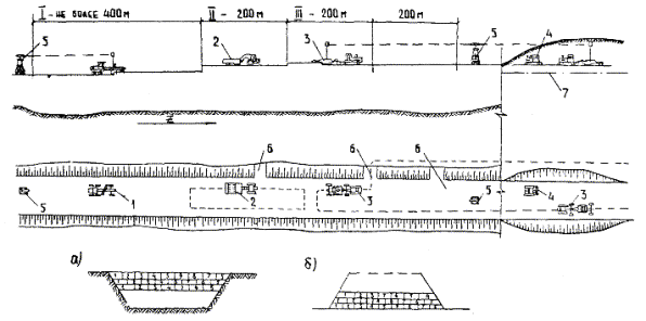2.7. Техника безопасностиПри возведении земляного полотна необходимо строго соблюдать требования: СНиП III-4-80 «Техника безопасности в строительстве», М., Стройиздат, 1980; ОСТ 35-10-80 М., ВПТИтрансстрой, 1981; «Типовой инструкции по охране труда для машинистов скреперов», М., Оргтрансстрой, 1974; «Типовой инструкции по охране труда для машинистов грунтоуплотняющих машин», М., Оргтрансстрой, 1975. Перед началом движения скрепера необходимо убедиться, что путь очищен от всех препятствий (от деревьев, кустарников, пней и камней). Места расположения подземных сооружений должны быть отмечены знаками. При транспортировке скрепера ковш следует поднять на 0,35 м от земли и надежно закрепить его на транспортных подвесках. Во избежание сползания скрепера под откос, при его транспортировке или разгрузке не разрешается приближаться к откосу выемки на расстояние менее 0,5 м. Запрещается разгружать скрепер, двигая его назад под уклон. При разработке, транспортировке, разгрузке, планировке и уплотнении грунта двумя и более машинами, идущими друг за другом, необходимо соблюдать расстояние между ними не менее 5 м. Запрещается находиться у ковша и выполнять какие-либо работы при поднятой передней заслонке или выдвинутой вперед задней стенке, а также при движении скрепера. Во время движения скрепера запрещается устранение неисправностей машины (регулировка и смазка) и перевозка людей. Каждый скрепер должен иметь звуковую сигнализацию, работа без которой запрещается. Очищать ковш скрепера от грунта разрешается только после полной остановки трактора лопатой или скребком. На допускается работа скреперов в мокрых глинистых грунтах. При сооружении насыпей для движения груженых скреперов должны устраиваться временные въезды и съезды, уклон которых в грузовом направлении не должен превышать 7°, в порожнем - 27°. Для буксировки самоходного скрепера следует применять только жесткий буксир, закрепленный за оба передних буксирных крюка. Нельзя оставлять скрепер незаторможенным, а также с работающим двигателем без водителя. При техническом обслуживании или ремонте скрепера не разрешается приступать к работе в следующих случаях: до отключения двигателя, до затяжки рычага ручного тормоза и установки колодок под колеса; при подъема скрепера или ковша скрепера над уровнем площадки без установки их на надежные опоры; запрещается смазывать, регулировать, ремонтировать части бульдозера при его движении. При работе катка следует соблюдать следующие требования: при работе катка любого типа запрещается движение тягача задним ходом; запрещается отцеплять загруженный одноосный каток на пневматических шинах; транспортировать катки на пневматических шинах необходимо на прицепе без балласта. При изменении направления движения самоходных катков всех типов необходимо подавать предупредительный сигнал. При нарезке сливной призмы расстояние от бровки насыпи до колеса автогрейдера должно быть не менее 0,5 м. Работа автогрейдера на участках с крупными камнями, мешающими нормальной работе, до их уборки не разрешается. При развороте автогрейдера в конце захватки или участка, а также на крутых поворотах, движение должно осуществляться на минимальной скорости. К работе на скрепере и автогрейдере, оборудованным автоматическими системами управления рабочими органами по ла
