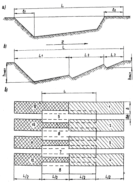 Зарезание грунта и заполнение ковша скрепера должны производиться только при прямолинейном движении тягача и скрепера. Для облегчения набора грунта в ковш скрепера, сокращения времени набора и достижения наибольшего заполнения ковша следует производить резание грунта при движении машины на первой передаче, обеспечивающей максимальное тяговое усилие. Резание грунта следует производить по возможности под уклон до 80 ‰. В глинистых грунтах необходимо применять ребристо-шахматную схему резания, а в сухих песчаных грунтах - гребенчатую схему зарезания грунта (рис. 8). Величину заслонки ковша скрепера регулируют во время резания грунта. Во всех случаях при наборе грунта в ковш скрепера следует срезать слой наибольшей толщины. С целью совмещения операций по набору грунта выемки и планировке верха земляного полотна (перед срезкой последнего слоя грунта выемки) увеличивают его фактическую толщину Dhупл. = (Нфакт. - Нпроект.), (3) где: Нпр. - проектная отметка основной площадки в выемке; Нфакт. - фактическая отметка верха земляного полотна в выемке. Перед началом срезки последнего слоя в выемке устанавливают второй пост лазерного излучателя так же, как и первый (на насыпи), если нет возможности использовать первый пост вследствие превышения действия лазерного излучателя (свыше 500 м). После этого скрепер ставят в начале выемки на заранее планированную эталонную площадку, отметки которой соответствуют проектным (в дальнейшем эталонной площадкой будет служить след ковша скрепера). Затем ковш скрепера с помощью ручного управления опускают до уровня поверхности площадки и в этом положении ковша поднимают штангу фотоприемника с таким расчетом, чтобы достичь проекции лазерного луча на среднюю линзу фотоприемника. Рис. 8. Способы резания грунта скреперами: а - обычный; б - гребенчатый; в - ребристо-шахматный; z - направление движения; L - длина набора грунта; l1 - путь резания; l2 - путь извлечения ковша скрепера; h - глубина резания; L1, L2, L3 - длина пути набора при 1 - 3 зарезании грунта; 1 - 12 - проходы скреперов; В - ширина захвата Сигналом о попадании лазерного луча на среднюю линзу фотоприемника служит загорание лампочки на панели индикатора в месте обозначения ± 0. Это положение фотоприемника фиксируется на шкале фотоотметчика высоты его подъема в кабине машиниста. Затем продольными сквозными проходами скрепера по длине выемки осуществляют срезку грунта и наполняют ковш. После транспортировки и отгрузки грунта в насыпь скрепер возвращается в выемку и, не доезжая до границы начала срезания (планировки) на расстояние 3 - 5 м машинист на ходу выставляет штангу фотоприемника на требуемую высоту (поворачивает ручку подъема до ранее зафиксированного положения отметчика высоты подъема фотоприемника) и включает автоматику. Затем операции повторяются. Фиксация положения фотоприемника на скрепере перед каждым циклом набора грунта обусловлена необходимостью выставлять штангу фотоприемника на разную высоту при наборе грунта в выемке при послойной отсыпке грунтов земляного полотна в насыпь (с использованием двух постов лазерных излучателей). 2.3.2.4. Перемещение грунта скрепером от выемки до места выгрузки При транспортировке грунта из выемки в насыпь рекомендуется передвигаться на третьей передаче. В данной технологической карте принята эллиптическая с