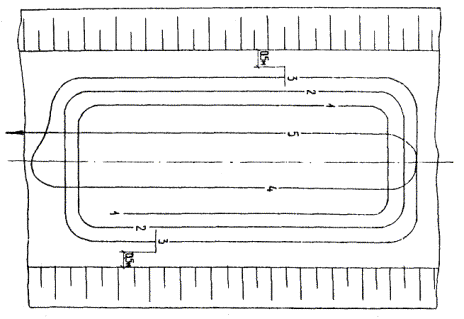 Первый и последний проходы катка на полосе укатки выполняют на малой скорости 2 - 2,5 км/ч, промежуточные проходы - на скорости 5 км/ч. Насыпные несвязные грунты уплотняют при давлении в шинах 2 - 4 кг/см2, а насыпные связные - при 5 - 6 кг/см2. После первых двух-трех проходов давление в шинах желательно увеличить в полтора-два раза. Технологическая схема уплотнения насыпи с применением пневмокатков показана на рис. 9. 2.3.2.6. Планировка верха земляного полотна и нарезка сливной призмы автогрейдером До начала планировочных работ геодезическая служба строительной организации должна произвести плановую и высотную разбивку оси и бровки земляного полотна, которая выполняется по знакам выноски проекта на местность и реперам при помощи геодезических инструментов и шаблона в соответствии с ВСН 186-75. После установки поста лазерного излучателя с целью обеспечения проектной отметки опорной оптической плоскости, необходимой для планировки верха земляного полотна, автогрейдер с фотоприемным устройством ставят в начале участка земляного полотна на предварительно подготовленную эталонную площадку (горизонтальная часть сливной призмы). Затем отвал автогрейдера с помощью ручного управления опускают на поверхность площадки и в этом положении рабочего органа поднимают штангу фотоприемника до загорания лампочки на панели индикатора ± 0, фиксируют нулевое положение задатчика высоты подъема ножа, нож автогрейдера в плане устанавливают под углом 70° к продольной оси земляного полотна и на первой скорости производится первая сквозная проходка на всю длину захватки. Рис. 9. Технологическая схема уплотнения насыпи пневмокатками: 1 - 5 - последовательность хода На первой захватке место эталонной горизонтальной площадки подготавливается вручную и устраивается в начале захватки. На последующих захватках исходной позицией является конец предыдущей (уже спланированной) захватки. Так как данный технологический процесс обеспечивает сооружение земляного полотна до выполнения отделочных работ с превышением проектных отметок не более 5 см, планировка верха земляного полотна и нарезка сливной призмы производится при наименьшем количестве проходок в соответствии с рис. 10 и табл. 4. Рис. 10. Порядок прохода автогрейдера при планировке и нарезке сливной призмы: + - направление рабочей проходки автогрейдера «туда»; - - то же «обратно» Таблица 4