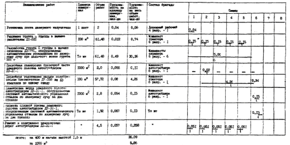Примечания. 1. В трудоемкость работ включено время на отдых машинистов и время на технологические перерывы в размере 10 %. 2. Цифрой над линией указана продолжительность операций, под линией - число рабочих. Таблица 16 2.6. Калькуляция затрат и заработной платы на возведение насыпи железной дороги высотой 1,5 м с применением машин, оборудованных автоматическим управлением по лазерному лучу
