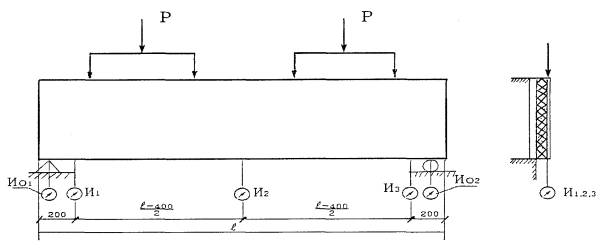 4.6 Испытания панелей на прочность и деформативность должны проводиться в порядке, указанном в разделе 5. 4.7 Оценка соответствия фактической прочности бетона (в проектном возрасте и отпускной) требуемым значениям должна проводиться по ГОСТ 18105. 4.8 Оценка результатов испытаний бетона на морозостойкость и водонепроницаемость - по стандартам на методы испытаний, указанные в разделе 5. 4.9 Показатели внешнего вида и правильность маркировки панелей проверяются сплошным контролем. 4.10 Предприятие-изготовитель должно сопровождать партию панелей паспортом, в котором указывается: - наименование и адрес предприятия; - дата изготовления и номер партии; - количество панелей каждой марки в партии; - материал и показатель теплопроводности утеплителя; - материал и марка стеклопластиковой связей; - обозначение настоящих технических условий. Паспорт должен быть подписан работником, ответственным за технический контроль на предприятии-изготовителе. 4.11 Потребитель может выполнять контроль качества покупаемых панелей, применяя при этом правила приемки и методы испытаний, установленные настоящими техническими условиями. 5 МЕТОДЫ КОНТРОЛЯ И ИСПЫТАНИЙ5.1 Испытания панелей на прочность и деформативность 5.1.1 Контрольные значения нагрузок должны приниматься в соответствии с подразделом 1.3.5. 5.1.2 Испытаниям должны подвергаться не менее двух образцов панелей, в качестве которых следует выбирать принятые техническим контролем предприятия-изготовителя глухую панель максимальной площади и панель с одним или двумя оконными проемами максимальной длины. 5.1.3 Схемы испытания на сжатие внутреннего слоя панелей, порядок проведения и оценка результатов этих испытаний должны приниматься по ГОСТ 8829. 5.1.4 Испытания для определения возможного смещения наружного слоя панели по отношению к внутреннему слою 5.1.4.1 Испытания должны проводиться по схеме, указанной на рисунке 1. 5.1.4.2 Домкраты, передающие нагрузку на испытываемую панель, должны работать от одной станции. 5.1.4.3 Нагрузка должна передаваться на наружный бетонный слой испытываемой панели. Рисунок 1 И - прогибомеры Ио - прогибомеры на опорах 5.1.4.4 Нагружение испытываемого образца должно производиться постепенно, частями, равными не более 20 % от контрольной нагрузки, указанной в рабочих чертежах; после каждого этапа нагружения испытываемая панель должна выдерживаться под нагрузкой в течение 30 минут; в конце каждого такого периода в журнале или протоколе испытаний должны фиксироваться показания всех прогибомеров. После достижения нагрузки, равной контрольной, показания прогибомеров не фиксируются. 5.1.4.5 По достижении нагрузки, равной 80 % от разрушающей нагрузки, указанной в рабочих чертежах, дальнейшее нагружение должно осуществляться долями, равными не более 10 % контрольной нагрузки; 5.1.4.6 Нагружение должно быть доведено до разрушения образца; признаком разрушения является непрерывное нарастание деформаций при очередном этапе нагружения из-за разрыва связей из стеклопластика; в случаях, когда разрушение бетона или разрыв стальной арматуры проявляются раньше непрерывного нарастания деформаций из-за разрыва связей из стеклопластика, признаки предельного состояния следует принимать в соответствии с ГОСТ 8829. 5.1.4.7 Значение нагрузки, при которой начинается разрушение образца, фиксируется в журнале или 