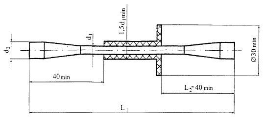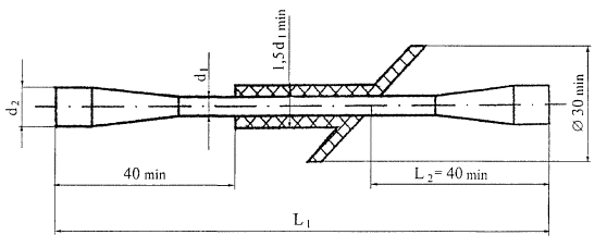 Рисунок 3 Гибкая связь с технологическим ограничителем под углом 45° к оси Обозначение: Связь наклонная X ХХХ.ХХ.ХХ.(L1/Н2/L2) ТУ 2296-001-20994511 (Например: Связь наклонная Б 196.00.00-02 (270/100/65) ТУ 2296-001-20994511) В обозначении связей: X ХХХ.ХХ.ХХ - обозначение чертежа связи по ТУ 2296-001-20994511 Н - толщина утеплителя L2 - глубина анкеровки Перечень нормативных документов, на которые даны ссылки