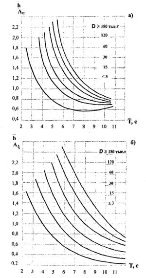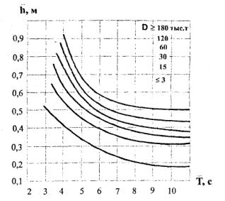 следует определять по номограммам с учетом водоизмещения расчетного судна D, тыс. т, среднего периода