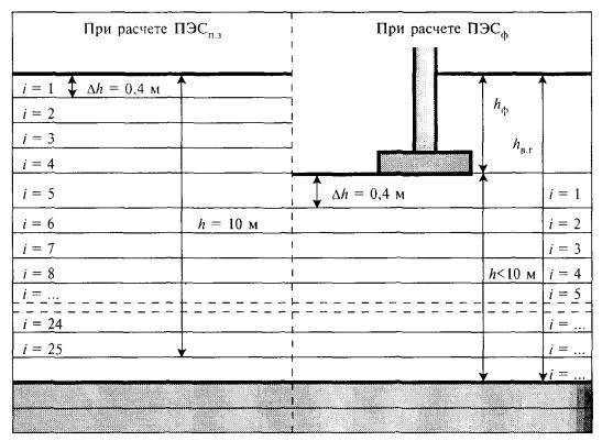где l - постоянная распада радона, равная 2,1×10-6 с-1; i = 1, 2, 3, ..., п - порядковый номер элементарного слоя грунта толщиной Dh = 0,4 м, считая от уровня поверхности земли (при расчете величины ПЭСп.з) или отметки заложения подошвы фундамента (при расчете величины ПЭСф); СRa,i - удельная активность радия-226 в i-м элементарном слое грунта, Бк/кг; kэ,i - коэффициент эманирования радона в i-м слое грунта; ri - плотность грунта i-го слоя, кг/м3; hi - 0,4(i - 1) - расстояние от уровня поверхности земли (при расчете величины ПЭСп.з) или отметки заложения подошвы фундамента (при расчете величины ПЭСф) до верхней границы i-го слоя грунта, м (рисунок А.1). Рисунок А.1 - Определение расстояний для расчета ПЭС А.3 Для всех элементарных слоев, находящихся ниже уровня первого водоносного горизонта, значения коэффициентов эманирования kэм,i следует принимать равными нулю при условии hв.г < hф + 10, где hв.г - глубина залегания первого от поверхности земли водоносного горизонта (м), hф - глубина заложения подошвы фундамента (от поверхности земли), м. А.4 Удельную активность 226Ra в грунтах, их плотность в естественном состоянии и коэффициенты эманирования радона рекомендуется измерять в пробах, отбираемых из каждого слоя геологического разреза в процессе бурения скважин при проведении геологических изысканий. Приложение Б(рекомендуемое) Задачи и содержание радиационно-экологических исследований, выполняемых на различных стадиях строительства