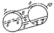 3.4. Наплавка металла после зачистки следов коррозии должна производиться электродами с основным покрытием типа Э50А марки УОНИ-13/55 (ГОСТ 9466, ГОСТ 9467) диаметром 2,5 мм. Особое внимание должно быть обращено на соблюдение режима сварки для предотвращения прожогов трубопровода. 3.5. Муфты должны быть развернутыми и быть изготовлены из труб, рекомендованных для строительства магистрального аммиакопровода (09Г2С или аналогичных). Длина разъемной муфты должна составлять не менее одного диаметра трубы. 3.6. При монтаже муфт при наличии свища между трубой и муфтой должна быть установлена прокладка из неопреновой или другой аммиакостойкой резины, после чего муфта стягивается болтами и обваривается. 3.7. Сварку муфты следует производить в последовательности, указанной на рисунке.