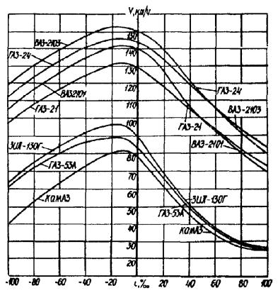 3.7. Максимальную скорость движения υ в зависимости от алгебраической разности уклонов Δi на переломах проектной линии, не сопрягаемых вертикальными кривыми, определяют по табл. 2 настоящих «Методических рекомендаций». 3.8. Максимальную скорость в зависимости от продольного уклона для основных расчетных автомобилей ГАЗ-24 и ЗИЛ-130 следует определять по табл. 3, а для остальных автомобилей - по графикам рис. 1 настоящих «Методических рекомендаций». Таблица 2