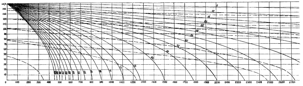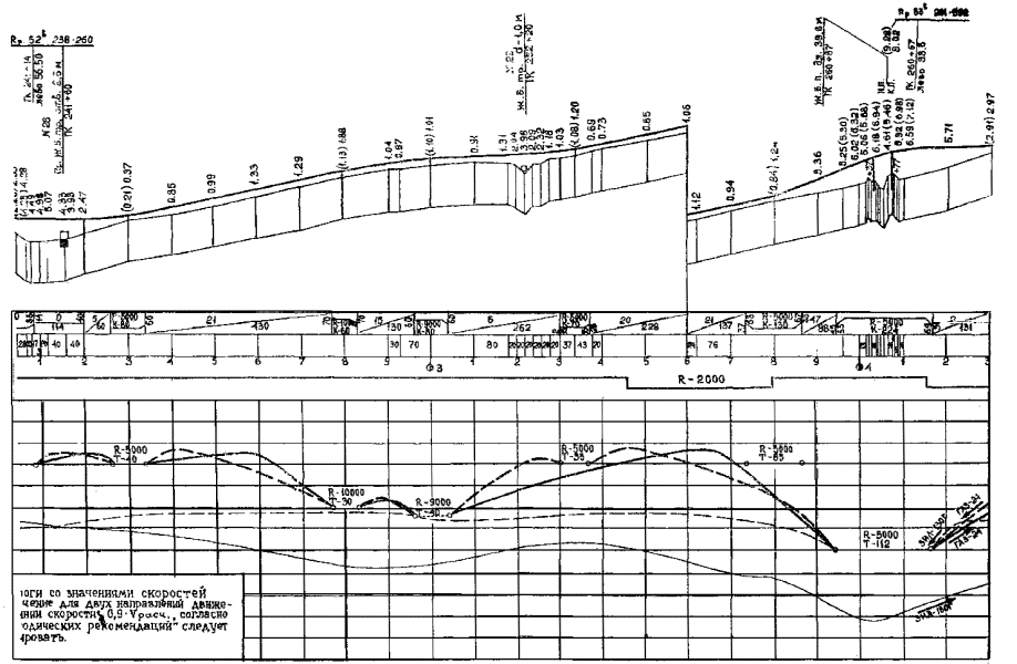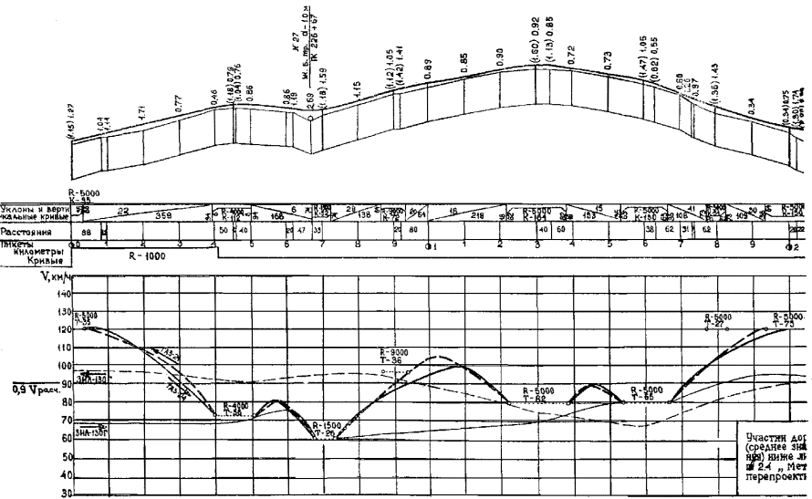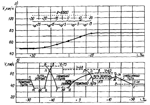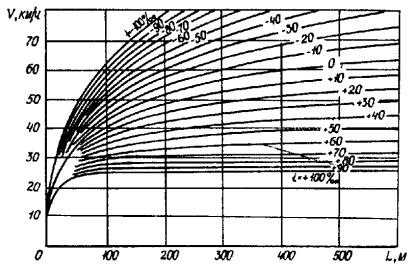 Рис. 3. Графики для определения путей разгона автомобиля ЗИЛ-130 Рис. 4. Графики для определения путей разгона автомобиля КамАЗ-5320 Рис. 5. График для определения тормозных путей Построение эпюр скоростей на переходных участках разгона и торможения следует производить по графикам рис. 2 - 5. 3.11. При определении скорости движения в местах переходов автомобилей со спусков или подъемов с малыми уклонами, которым соответствует высокая скорость движения, к значительным подъемам с соответствующей им намного меньшей скоростью изменение скорости следует принимать постепенным с учетом прохождения автомобилями некоторой части подъемов за счет кинетической энергии. Длину инерционных путей в этих случаях следует определять по графикам рис. 6 настоящих «Методических рекомендаций» или по формуле где Lи - путь, проходимый автомобилями за счет кинетической энергии, м; υ1 - скорость в момент перехода автомобиля на подъем, км/ч; υ2 - максимальная скорость для конкретного автомобиля на данном подъеме, км/ч. Рис. 6. Схема построения линии скорости: а) в пределах кривой в продольном профиле; б) по участку дороги 3.12. Скорость движения в пределах кривых в продольном профиле определяется по формуле (7) с учетом средней величины уклона отдельных участков (в зависимости от длины вертикальной кривой ее заменяют ломаной линией, разделенной на ряд участков длиной 50, 100 или 200 м). Уклон на участке принимается постоянным и равным среднему значению уклонов крайних точек участков. где υk - скорость в конце участка, км/ч; υн - скорость в начале участка, км/ч; L - длина участка, м; iср - средневзвешенный уклон на участке в десятичных дробях. 3.13. Построение эпюры максимально возможной скорости движения выполняется на листах продольных профилей или на отдельных листах. Горизонтальный масштаб следует принимать таким же, как при построении продольного профиля. Все графики для построения эпюры скорости движения даны в масштабе: горизонтальном 1:5000, вертикальном 1:10. 3.14. Исходя из имеющихся элементов трассы: продольных уклонов, радиусов кривых в плане и продольном профиле, а также переломов проектной линии в продольном профиле, наносятся линии ограничения скорости движения, полученные по формулам (1) - (3), табл. 1 - 3 и рис. 1 настоящих «Методических рекомендаций». Ограничения скорости наносятся пунктирными линиями только в пределах соответствующих участков (например, длина кривой) (приложение 1 настоящих «Методических рекомендаций»). На лист, предназначенный для построения эпюры скорости, наносится масштабная сетка, выписываются параметры элементов, пикеты и километры. Продольные уклоны выписываются в тысячных долях: для подъемов - со знаком плюс, для спусков - со знаком минус. При оценке трассы в обоих направлениях знаки уклонов для построения эпюры скорости в обратном направлении соответственно принимаются с противоположным знаком. 3.15. Линии максимально возможных скоростей движения в зависимости от продольных уклонов наносятся по табл. 2 и графикам рис. 1 настоящих «Методических рекомендаций». 3.16. Во всех случаях, когда продольные уклоны позволяют перейти от скорости, ограниченной дорожными условиями, к более высокой скорости, линия максимально возможной скорости может быть найдена в зависимости от типа расчетного автомобиля по графикам путей разгона (рис. 2 - 4) или по формул