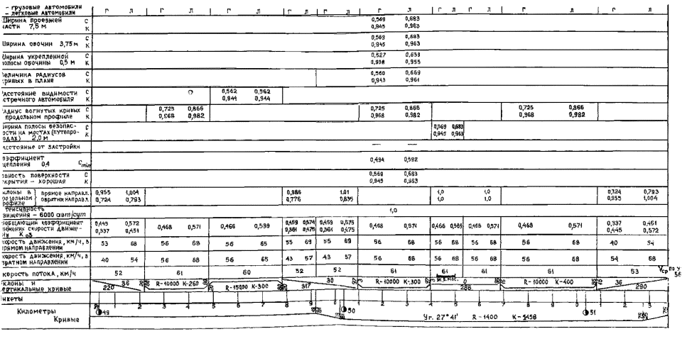 РЕКОМЕНДАЦИИ Одобрены Минтрансстроем Москва 1982 МЕТОДИЧЕСКИЕ РЕКОМЕНДАЦИИ ПО ОЦЕНКЕ ПРОЕКТНЫХ РЕШЕНИЙ АВТОМОБИЛЬНЫХ ДОРОГ ПО СКОРОСТИ ДВИЖЕНИЯ. Союздорнии. М., 1982. Изложена методика оценки проектных решений по наибольшей технической скорости движения одиночных транспортных средств, а также по средней скорости движения потока автомобилей. Учитываются характерные режимы движения одиночных автомобилей в различных дорожных условиях. Для оценки проектных решений по средней скорости движения транспортных потоков разработан метод коэффициентов, учитывающий снижение скорости движения потока в зависимости от элементов плана, продольного и поперечного профилей и интенсивности движения. Рассматриваются параметры, влияющие на скорость движения, которые позволяют с большей точностью подходить к оценке проектных решений. Табл. 12, рис. 7. Предисловие«Методические рекомендации по оценке проектных решений автомобильных дорог по скорости движения» разработаны Союздорнии в развитие раздела «Безопасность и организация движения» СНиП II-Д.5-72 «Автомобильные дороги. Нормы проектирования». Настоящие «Методические рекомендации» предназначены для оценки проектных решений при разработке проектно-сметной документации на строительство и реконструкцию автомобильных дорог. Оценка проектных решений производится как по наибольшей технической скорости движения, устанавливаемой для автомобилей и автопоездов, наиболее характерных для движения по проектируемой дороге, так и по средней скорости движения транспортного потока, что позволяет более объективно судить о качественной стороне принимаемых проектных решений. «Методические рекомендации разработали канд. техн. наук Н.Ф. Хорошилов, инженеры О.Н. Яковлев, Н.А. Рябиков, Н.С. Беззубик, А.В. Ионов (Союздорнии) при участии инженеров Н.Н. Чуклинова (ВНИИБД МВД СССР), М.Т. Работяги (МАДИ). 1. Общие положения1.1. Оценку проектных решений по скорости движения следует производить при разработке проектно-сметной документации на строительство и реконструкцию автомобильных дорог I, II и III категорий и в отдельных случаях - IV и V категорий, особенно на сложных участках, при проектировании которых используются предельные значения норм по отдельным элементам или допускаются отступления от них. 1.2. Принимаемые в проектах решения по назначению различных элементов дорог и их совокупности следует оценивать как по максимальной скорости движения, устанавливаемой для автомобилей и автопоездов, наиболее характерных для движения по проектируемой дороге, так и по средней скорости движения транспортного потока, что позволяет более объективно судить о качественной стороне принимаемых проектных решений. 2. Оценка обеспеченности расчетной скорости движения2.1. Для оценки проектных решений автомобильных дорог по степени обеспеченности расчетной скорости движения принимается метод определения максимальных скоростей движения автомобилей в зависимости от параметров основных элементов плана и продольного профиля дороги. 2.2. Оценивать проектные решения следует по максимальной скорости движения одиночных автомобилей, наиболее характерных для движения по проектируемой дороге. Для автомобильных дорог I - III категорий в качестве расчетного автомобиля принимают, как правило, автомобиль ГАЗ-24, а для дорог IV и V кате