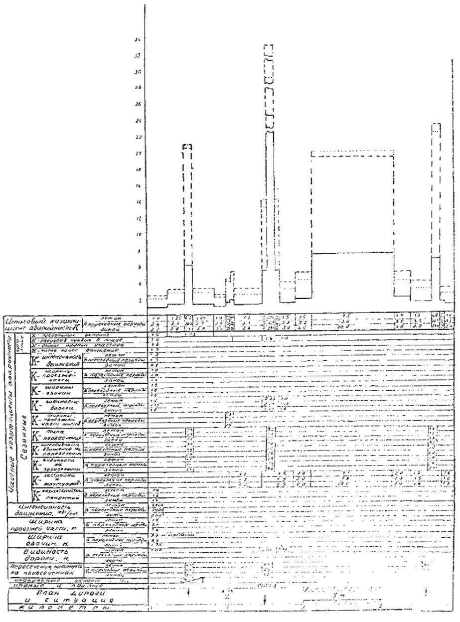 2. С учетом зон влияния дорожных элементов определяются величины частных коэффициентов аварийности для каждой дорожной ситуации и записываются в соответствующие строки формы графиков коэффициентов аварийности. 3. По табл. 2 устанавливаются сезонные поправочные коэффициенты и умножаются на соответствующие значения дорожных элементов. 4. По полученным от умножения значениям определяются величины частных коэффициентов аварийности (по табл. 1) для различных сезонов и записываются в соответствующие строки формы графиков коэффициентов аварийности. 5. Значения частных коэффициентов аварийности на участках с однородными условиями движения для каждого из сезонов перемножаются и определяются сезонные итоговые коэффициенты аварийности. 6. По полученным значениям сезонных итоговых коэффициентов аварийности строятся сезонные линейные графики. 7. На соответствующие сезонные графики коэффициентов аварийности условными обозначениями наносятся сведения о дорожно-транспортных происшествиях по сезонам года. III. Третий пример рассматривает порядок анализа сезонных графиков коэффициентов аварийности, приведенных на рис. 2. Для этой цели все значения сезонных графиков коэффициентов аварийности по участкам сводятся в таблицу. После этого, по данным табл. 6 составляется сводная ведомость опасных участков на дороге, выявляются причины повышения опасности движения и намечаются мероприятия по повышению безопасности движения (табл. 7). Таблица 6