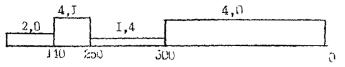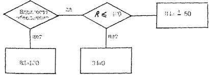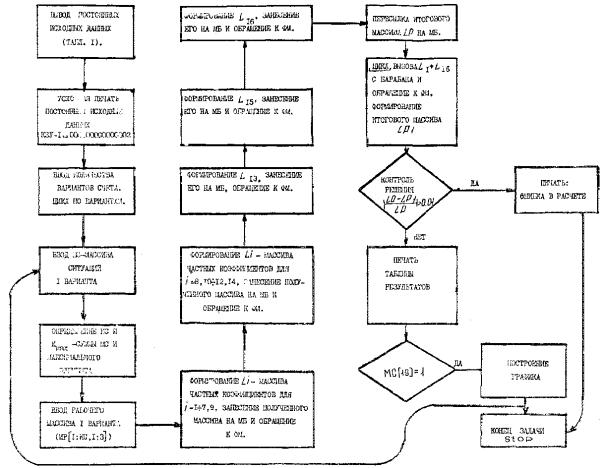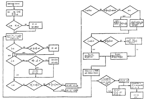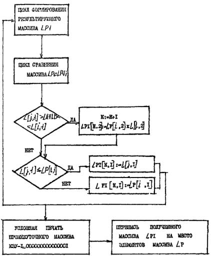 Примечания: *) - возможна интерполяция в указанных пределах; **) - цифры с 1 по 7 для коэффициента К16 означают: 1 - гололед (коэффициент сцепления φ = 0,1); 2 - снежный накат (φ = 0,15 - 0,35); 3 - скользкое, грязное покрытие (φ = 0,2 - 0,3); 4 - мокрое покрытие (φ = 0,4); 5 - чистое, сухое покрытие (φ = 0,6); 6 - шероховатое покрытие (φ = 0,7); 7 - очень шероховатое покрытие (φ = 0,75). 2. Алгоритм программы. Для определения итогового коэффициента аварийности в программе последовательно формируются двухмерные массивы, представляющие собой расстояние, до которого включительно частный коэффициент остается постоянным (I элемент массива) и само значение коэффициента аварийности (II элемент массива). Так как изменение частных коэффициентов аварийности происходит скачкообразно, сохраняя постоянное значение в пределах участка определенной длины, то для получения всех значений расстояний и соответствующих им коэффициентов достаточно указать только конечное значение расстояния, на котором действует коэффициент (рис. 4). График коэффициентов аварийности, представленный на рис. 5, достаточно записать в виде двухмерного массива: 140 250 500 1000 2,0 4,1 1,4 4,0 Рис. 4. Укрупненная блок-схема программы Рис. 5. Пример записи графика коэффициентов аварийности В каждом таком массиве первый элемент - расстояние, в пределах которого действует частный коэффициент, а второй элемент - величина частного коэффициента аварийности, которая выбирается из табл. 8. В программе происходит последовательное формирование массивов значений частного коэффициента и соответствующих расстояний по каждой дорожной ситуации. После формирования одного массива следует обращение к процедуре ФМ (формирования массива). С помощью этой процедуры производится логический анализ элементов двух массивов частных коэффициентов и формируется новый промежуточный массив расстояний, на которых действуют коэффициенты Кi ´ Кj и вычисляются значения коэффициентов в пределах этих расстояний. После получения первого промежуточного массива он переписывается на место одного из рабочих, подготавливается следующий массив по очередной дорожной ситуации и операции повторяются до тех пор, пока не будет вычислен массив итогового значения коэффициента аварийности. Так как для работы ФМ необходимы два массива, то перед первым обращением к ФМ формируется массив из двух элементов. Массивы для процедуры ФМ изготавливаются в виде двухмерных матриц: I. L1 К1 II. L'1 К'1 L2 К2 L'2 К'2 ... ... Lj Кj L'i К'i Затем в цикле производится сравнение Lj и Li и формируется результирующая матрица. После этого производится аналогичное сопоставление результирующей матрицы с новой матрицей, составленной из элементов очередной дорожной ситуации и т.д. (см. блок-схему процедуры ФМ - рис. 6). Массивы по некоторым дорожным ситуациям формируются аналогично, что позволило объединить их формирование в процедуру Р1 (см. блок-схему процедуры Р1 - рис. 7). С помощью P1 производится формирование массивов по интенсивности движения (i = 1), по ширине проезжей части (i = 2), ширине обочин (i = 3), продольному уклону (i = 4), по радиусам кривых (i = 5), по видимости в плане и профиле (i = 6 и i = 7) и по длине прямых участков (i = 9). Исходные данные об изменении величины частного коэффициента и расстояниях берутся из массива МР (рис. 8). 2.1. Для организации массива частного коэффициента аварийности по интенсивности движения (i