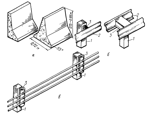 5.8. Чтобы ограждение разделительной полосы моста занимало ее минимальную ширину, рекомендуется использовать двустороннее барьерное ограждение с W-образными профильными планками (см. рис. 1б). 5.9. Если металлическое двустороннее ограждение необходимо установить только на разделительной полосе моста, его концевые части рекомендуется выводить за пределы моста на расстояние не менее 20 - 30 м. На расстоянии 12 м профильные планки обеих сторон следует приблизить к поверхности земли и одновременно сблизить их примерно до 0,4 м между наружными кромками планок. На всем участке наклона планки каждая сторона ограждения должна крепиться к отдельному ряду стоек. На участке длиной 8 м от торцов планок шаг стоек должен быть 1 м; крепление профильных планок к стойкам - без амортизаторов. Оставшиеся 4 м планки должны крепиться к стойкам с помощью распорок-консолей при шаге стоек 2 м. Аналогично нужно оборудовать оба конца ограждения. 5.10. При сопряжении парапетного ограждения разделительной полосы моста с полужестким ограждением на подходе к нему последнее на расстоянии 12 м до места сопряжения должно быть усилено путем уменьшения шага стоек до 2 м (рис. 4). Сопряжение двух типов ограждений должно находиться не менее чем в 20 - 30 м за пределами моста. Его рекомендуется выполнять путем наложения не менее 8 м профильных планок на бетонное ограждение, причем планки крепятся на боковой поверхности бетонного ограждения таким образом, чтобы их высота была постоянной и составляла 0,8 м. Планки крепятся с помощью болтов, которые должны обеспечивать их перемещение в продольном направлении в овальных отверстиях. Рис. 4. Сопряжение барьерного ограждения с парапетным: 1 - амортизатор; 2 - планка; 3 - стойка 5.11. Если ширина разделительной полосы на мосту меньше, чем на дороге, переход от одного ограждения к другому целесообразно осуществлять исходя из соотношения 1:20, отступив от моста не менее 20 - 30 м. 5.12. На мостах, путепроводах и эстакадах, а также для ограждения опор путепроводов не следует применять тросовые ограждения. 6. Установка и ограждение мачт освещения, опор дорожных знаков и путепроводов6.1. Опоры дорожных знаков следует устанавливать за пределами обочин на присыпных бермах. В стесненных условиях (у обрывов, выступов скал и т.п.) допускается их установка на обочинах таким образом, чтобы опоры знаков не создавали опасности при наезде на них транспортных средств. 6.2. В исключительных случаях, когда знаки размещаются на обочинах или разделительных полосах, следует использовать ударобезопасные конструкции опор (из дерева или предварительно напряженного бетона). При этом верхний обрез фундамента опоры должен выполняться заподлицо с поверхностью обочины или разделительной полосы. Расстояние между кромкой проезжей части и ближайшим к ней краем дорожного знака должно составлять не менее 1 м. 6.3. На автомагистралях с высотой насыпи до 1 м при бескюветном поперечном профиле земляного полотна информационно-указательные знаки на двух- и трехстоечных опорах целесообразно располагать на максимальном расстоянии от края проезжей части в соответствии с ГОСТ 23457-79. Технические средства организации движения. Условия применения (п. 2.1.8). 6.4. Сечения деревянных опор рекомендуется ослаблять путем высверливания отверстий на высоте 0,15 - 0,45 м от поверхности земли. Оси отверстий