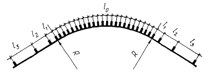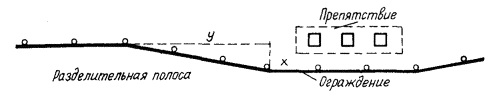 1 Рассчитана на пятилетний период. 4.3. Ограждения в населенных пунктах должны устанавливаться на разделительных полосах при их ширине менее 4 м на городских скоростных дорогах и менее 2 м - на магистральных улицах с непрерывным движением и дорогах грузового движения. 4.4. Если на разделительной полосе отсутствуют опасные объекты (рамные и консольные опоры дорожных знаков, опоры путепроводов, мачты освещения и т.п.) или если проезжие части противоположных направлений движения расположены в одном уровне или перепад высот между ними составляет менее 0,3 м, ограждение следует устанавливать на оси разделительной полосы. 4.5. Промежуточные опоры путепроводов, мачт освещения, рамные и консольные опоры дорожных знаков и другие неэнергоемкие объекты, расположенные на разделительной полосе, следует защищать ограждениями от возможных наездов автомобилей таким образом, чтобы препятствие находилось между планками ограждения. При небольшой ширине разделительной полосы не всегда можно устанавливать ограждения с необходимым запасом расстояния до препятствия. Поэтому в целях снижения значительных перемещений ограждения при наезде на него автомобиля стойки следует располагать через 2,5 м. 4.6. Для обеспечения лучшего оптического восприятия направления движения водителем ограждение на разделительной полосе необходимо по возможности устанавливать на одинаковом расстоянии от кромки проезжей части. 4.7. Отклонение ограждения в плане от первоначального положения при возникновении на пути его размещения препятствия, уширения или сужения разделительной полосы предлагается назначать исходя из условия Рис. 2. Отклонение ограждения в плане от первоначального направления 4.8. При вогнутом профиле разделительной полосы и крутизне откосов 1 : 4 и более ограждения рекомендуется устанавливать в случае, если интенсивность движения на дороге составляет свыше 5 тыс. авт/сут. 4.9. На разделительных полосах с вогнутым профилем и крутизной откосов менее 1 : 4 целесообразно устанавливать ограждения при ширине разделительной полосы и интенсивности движения, указанных в табл. 3. Таблица 3