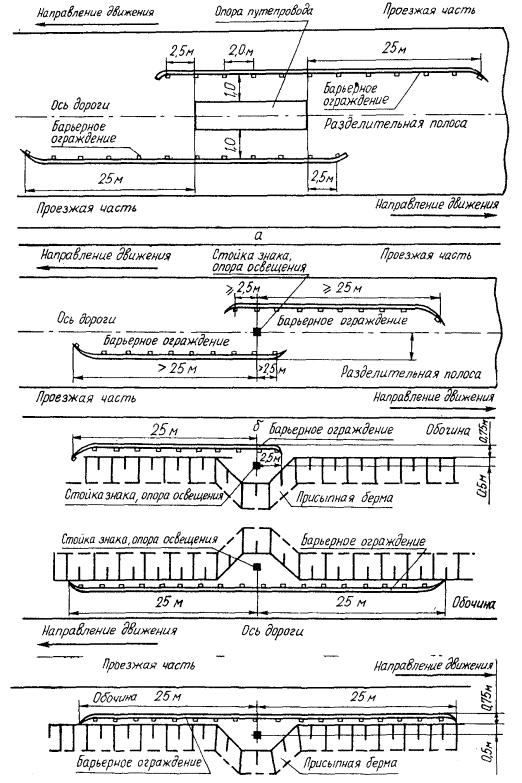 3.6. На особо опасных участках дорог в горных районах необходимо использовать ограждения парапетного типа. 3.7. Для удержания автомобилей на проезжей части дорог, проходящих через населенные пункты, где разрешенная скорость движения не превышает 60 км/ч, допускается применять бордюры высотой не менее 0,25 м. 3.8. На участках дорог, где разрешенная скорость движения не превышает 40 км/ч, применение барьерных и парапетных ограждений не рекомендуется. 4. Установка ограждений на разделительных полосах дорог4.1. В целях предотвращения выезда автомобилей на полосу встречного движения на разделительных полосах дорог шириной менее 5 м следует устанавливать ограждения. 4.2. Вне населенных пунктов ограждения должны устанавливаться на разделительной полосе автомобильных дорог с учетом условий, указанных в табл. 2. Таблица 2