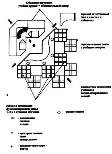 ПРИМЕР ОБЪМНО-ПЛАНИРОВОЧНОГО РЕШЕНИЯ ЭКСПЕРИМЕНТАЛЬНЫЙ ПРОЕКТ ШКОЛЫ НА 22-24 КЛАССА ПЕРСПЕКТИВНОЙ мoдели для г.москвы (по материалам московского конкурса 1995 г. первая премия) (арх.Степанов В.И. Степанов А.В. Бессонова Г.А.) Рисунок 8.1