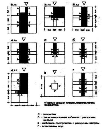Примечание: Условные сокращения (Т, А, И), см. табл. 13. 10. ОБЪЕМНО - ПЛАНИРОВОЧНОЕ РЕШЕНИЕ ЗДАНИЙ.10.1. Общие требования к структуре здания.10.1.1. Функциональная модель школы строится по принципу организации уровней обслуживания учащихся и охватывать все звенья учебного и воспитательного процессов: - первый уровень - учебное помещение класс-кабинет; - второй уровень - группа учебных помещений, связанных между собой единым взаимодополняющим процессом (учебная секция, технологическая группа), в которой не все помещения используются в течение дня, но служат базой для организации полноценного обучения в течение недели; - третий уровень - группы учебных секций или технологических групп помещений, работающих в органической связи с информационно-методическим центром школы и отдельными специализированными учебными помещениями, используемыми в течение месяца и во внеучебное время; - четвертый уровень - как целое, предусматривает необходимое функционирование и органическое взаимодействие между Учебным комплексом, Информационно-методическим центром и Общешкольной группой помещений в течение полного дня, недели, месяца, года, в котором тесно переплетается учебная и внеучебная деятельность; обеспечиваются в конечном итоге разностороннее развитие личности и ее творческого потенциала. 10.1.2. В соответствии с функциональной моделью архитектурно-типологическая структура школы должна иметь следующую пространственную организацию: - Учебная группа - Информационно-методический центр - Общешкольная группа помещений (три элемента, связанных между собой в единое целое с обеспечением их автономного функционирования и одновременно тесной функциональной связи); - Учебная группа помещений в свою очередь должна быть дифференцирована на школы I, II, III ступеней обучения и технологические группы помещений, обслуживающие эти возрастные школы; - Общешкольная группа помещений должна подразделяться на отдельные функциональные группы по назначениям - спорт, группа зрительного зала, технического творчества и биолого-опытнической деятельности, художественного воспитания (музыка, изобразительное искусство, хореография) - и быта; - Группа помещений центра информации - библиотеки, предназначенная для обслуживания учебной и общешкольной функциональных групп помещений, должна быть связующим звеном между учебными и общешкольными помещениями. Пример: Приложение 2, рис. 2 (Концепция функционального решения общеобразовательной школы перспективной модели). 10.1.3. Учебные помещения, дифференцированные по возрастному принципу или педагогической технологии, должны решаться по принципу компактной их организации с пространственным центром в виде рекреационных залов, или аудиторий, или ресурсных или игровых центров и т.д., обеспечивающих оптимальную организацию учебного процесса и внеурочного времени: - в школе I ступени с игровым центром; - в школе II-III с ресурсным центром и универсальным рекреационным залом; - в блоках специализированных учебных помещений, изучения технологий и труда с ресурсными или методическими центрами, без рекреационного зала. - примеры схем решения компактных учебных секций приведены в Приложении 2, рис. 3 10.1.4. Основное помещение школы - класс - учебный кабинет - должно отвечать требованиям активного ведения учебного урока с организацией к