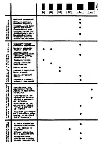 9. ПРИНЦИПЫ РАСЧЕТА ВМЕСТИМОСТИ И ПРОПУСКНОЙ СПОСОБНОСТИ ОБЩЕОБРАЗОВАТЕЛЬНЫХ УЧЕБНЫХ ЗДАНИЙ.Этот расчет предназначен для школ, размещаемых в жилых микрорайонах и являющихся наиболее массовыми. Суть его состоит в том, что классы и классы-кабинеты, кроме учебной функции, несут еще функцию "дома" в течение дня для определенной классной группы учащихся. Оно (помещение) является пространством для организации досуга и внеклассного времени во внеурочное время. Отсюда следует, что одиннадцатилетняя школа должна иметь 11 классных помещений (1:1:1) или 22 (2:2:2) т.д. (соответственно 275 или 550 и т.д. учащихся). Остальные помещения школ, как-то лаборатории, мастерские и др. в расчет вместимости не принимаются. 9.1 Расчет учебных помещений школ районного уровня.9.1.1. Школам районного уровня сетевым, с профильным обучением, лицеям, гимназиям, с увеличенным числом параллелей старших возрастов учащихся требуется большее число специализированных кабинетов. Вместимость этой группы учебных зданий зависит от эффективного использования специализированных учебных кабинетов в максимально отведенное учебное время. Поэтому в расчет включаются не только классы и классы-кабинеты, но и группы помещений специализированных кабинетов. 9.1.2. Основой расчета служить учебный - план (Табл.2-Н, 2-ОС, 2-СТ), на основе которого, подставляя учебные часы по всем предметам учебного плана, можно определять дифференцированное количество учебных часов по предметам (математика, литература, обществоведение, естественные науки и т.д.) деля их на 30 учебных часов (оптимальная загрузка кабинета в неделю) и оставляя резерв в размере 15 % (примерно 5 часов). 9.1.3. Пример возможного расчета количества учащихся в однокомплектных, двухкомплектных и трехкомплетных школах на основе базисного учебного плана: -в соответствии с базисным учебным планом количество часов отводимых учащимся 5-11 классов составляет 181 час; -при расчетной величине - 30 час. в неделю на 1 класс, требуется 6 учебных помещений на однокомплектную школу; -в соответствии с учебными дисциплинами в школе 1:1:1 должно быть для 5-11 классов 7 универсальных кабинетов + 3 лаборатории естественных наук + кабинет искусства + кабинет технологии. Итого 12 помещений (это не считая помещений мастерских, спорт зала, кружков и т.д.); - следовательно, число классных групп с 5-11 класс может быть удвоено, т.е. школа может функционировать со структурой 1:2:2 (18 классных групп вместо 11). 9.1.4. Пример показывает, что число учащихся по сравнению с расчетом первой системы может быть увеличено примерно на 40 %. Кроме того, здесь следует учитывать направленность обучения старшего звена школы, что отражается на составе принимаемых помещений (больше химии или ее меньше, больше математики или ее меньше). 9.2 Расчет общешкольных, помещений9.2.1. Общеобразовательная школа осуществляет односменные занятия с 8.30 до 14.05 часов. Внеучебная деятельность осуществляется во второй половине дня. 9.2.2. Принимая, что контингент учащихся во внеучебное время находится в школе (продленный или полный день), для расчета количества помещений за цикл принимается один день. 9.2.3. Учащиеся во внеучебное время могут заниматься в кружках в среднем в две смены: с 15.00 до 17.00 и с 17.30 до 19.30 часов ежедневно в течение учебной недели. 9.2.4. Население микрорайона может пользоваться общешкольными помещениями одну-две 