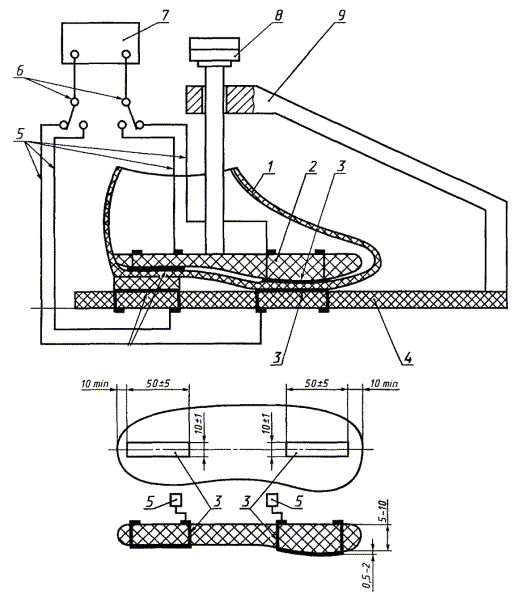 5.2 Испытания специальной одежды, обуви, а также вентиляционных труб должны проводиться на образцах готовых изделий. Для испытаний должны быть представлены: - материалы специальной одежды и вентиляционных труб - не менее 1 м2 каждого вида; - спецобувь - две пары. 5.3 Определение геометрических параметров 5.3.1 Геометрические параметры определяют с целью проверки их соответствия требованиям 4.4 и 4.9. Проверяют также соответствие испытуемых образцов технической документации. 5.3.2 Неметаллические изделия на соответствие технической документации проверяют осмотром и измерениями с использованием стандартного измерительного инструмента, обеспечивающего определение геометрических параметров с погрешностью, указанной в рабочих чертежах на конкретное неметаллическое изделие. При наличии в неметаллическом изделии нескольких одинаковых по конструкции сборочных единиц допускается проводить измерения параметров только одной сборочной единицы. 5.3.3 Проводят не менее трех измерений каждого геометрического параметра. Из результатов трех измерений учитывают только максимальное значение геометрического параметра. 5.3.4 По данным, полученным в результате определения значений геометрических параметров, считают, что оболочки взрывозащищенного и рудничного электрооборудования допустимы к применению, если соблюдены соответствующие положения таблицы 1. 5.4 Электрическое сопротивление и удельное поверхностное электрическое сопротивление определяют в соответствии с требованиями 4.7 - 4.9, 4.11 и 4.12. 5.4.1 Удельное поверхностное электрическое сопротивление материала измеряют по ГОСТ 6433.2, ткани - по ГОСТ 19616, вентиляционных труб - по методике приложения А. 5.4.2 Электрическое сопротивление измеряют: - оболочки - по ГОСТ 6433.2; - конвейерные ленты - по ГОСТ 20; - вентиляционные трубы - по методике, приведенной в приложении А; - специальную обувь - по методике, приведенной в приложении Б. 5.4.3 Образец при подготовке к испытаниям кондиционируют не менее 24 ч в испытательной камере, термостате или помещении при температуре (23 ± 2) °С и относительной влажности воздуха (50 ± 5) %. 5.4.4 Образцы располагают так, чтобы расстояние между ними и стенками испытательной камеры было не менее 50 мм, а между собой - не менее 20 мм. 5.4.5 Проводят не менее девяти измерений электрического сопротивления. Результат испытания выражают средним арифметическим значением первичных данных измерений и средним квадратичным значением их отклонений от среднего арифметического значения. 5.4.6 При отсутствии особых требований стандартов и норм на объект испытания по данным, полученным в результате измерений, считают, что спецодежда выдержала испытание, если удельное поверхностное электрическое сопротивление ткани не превышает 1 · 109 Ом. 5.4.7 При отсутствии особых требований стандартов и норм на объект испытания по данным, полученным в результате измерений, считают, что спецобувь выдержала испытание, если электрическое сопротивление изоляции между внутренней и ходовой сторонами подошвы и каблука не превышает 1 · 108 Ом, но не менее 1 · 106 Ом. 5.4.8 По данным, полученным в результате измерений, считают, что конвейерные ленты или вентиляционные трубы выдержали испытание, если их удельное поверхностное электрическое сопротивление не превышает 3 · 108 Ом. 5.4.9 При отсутствии особых требований стандартов и норм на 
