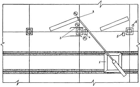 пересекающихся плоскостей. При несовпадении рисок на гранях колонны и на фундаменте монтажники ломами рихтуют низ колонны в проектное положение. Затем, руководствуясь сигналами геодезиста, выверяющего колонну с помощью двух теодолитов, монтажник М1 сигнализирует машинисту крана о смещении верха колонны в ту или иную сторону до проектного положения. После этого монтажники забивают в зазор между нижней частью колонны и стенками фундамента стальные клинья